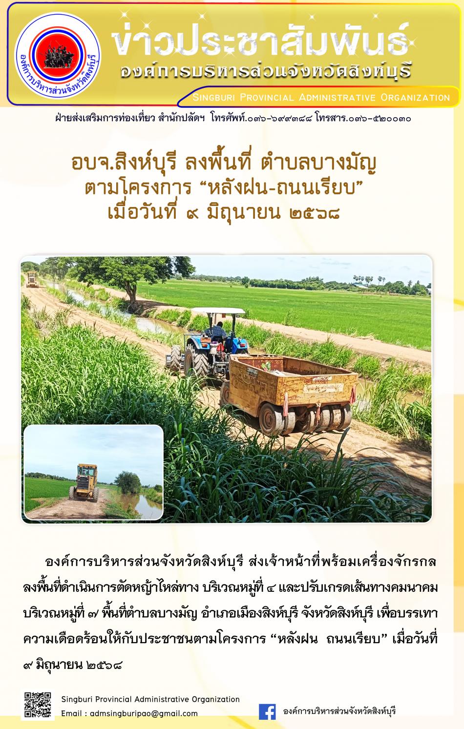 อบจ.สิงห์บุรี ลงพื้นที่ ตำบลบางมัญ ตามโครงการ "หลังฝน - ถนนเรียบ" [9 มิถุนายน 2568]