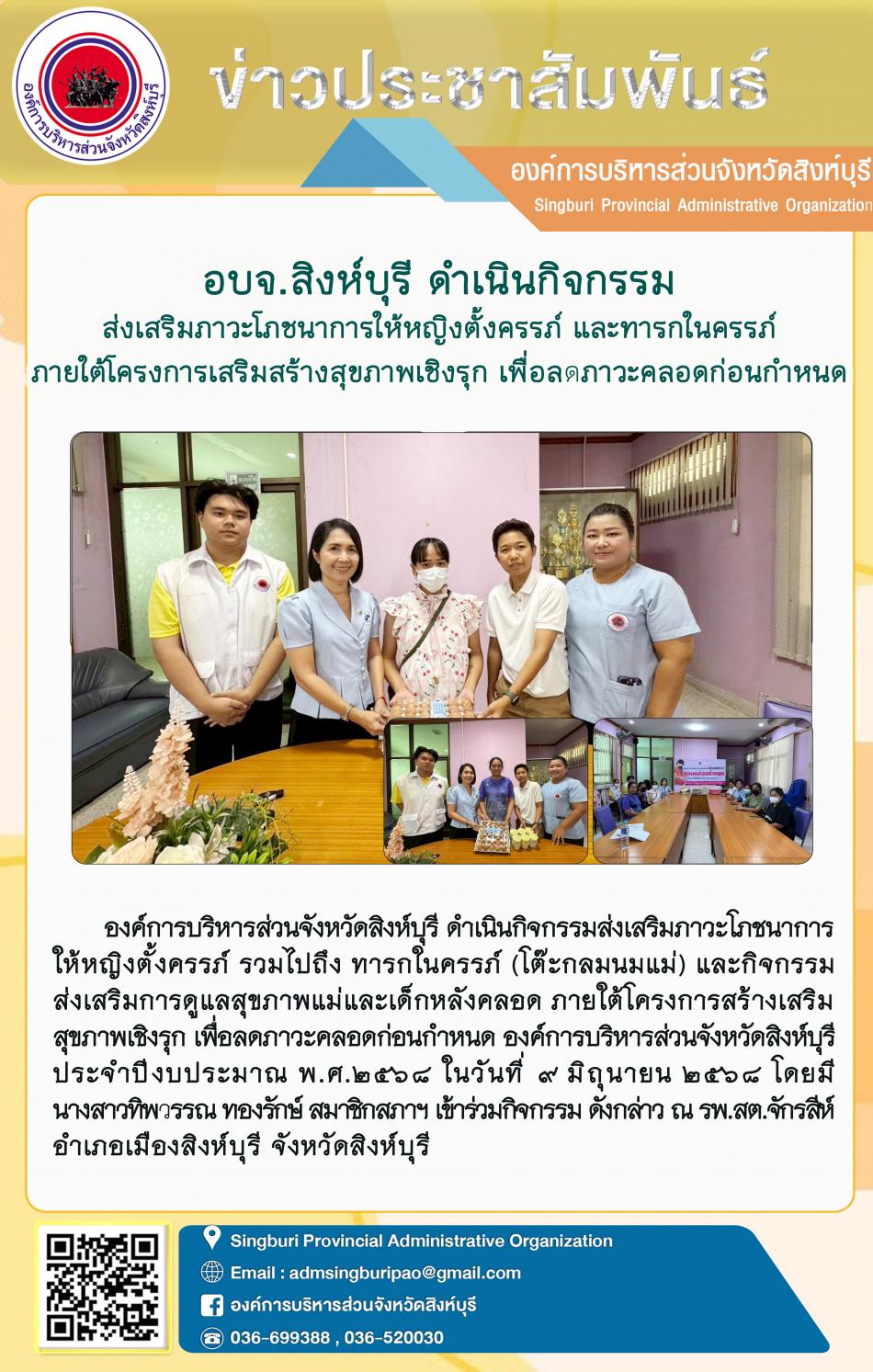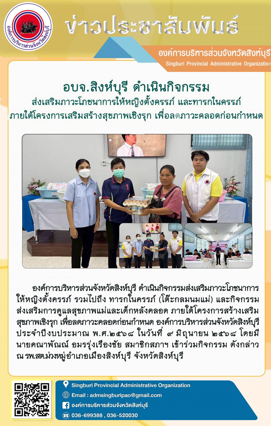 อบจ.สิงห์บุรี ดำเนินกิจกรรมส่งเสริมภาวะโภชนาการให้หญิงตั้งครรภ์ และทารกในครรภ์ภายใต้โครงการเสริมสร้างสุขภาพเชิงรุก เพื่อลดภาวะคลอดก่อนกำหนด [9 มิถุนายน 2568]