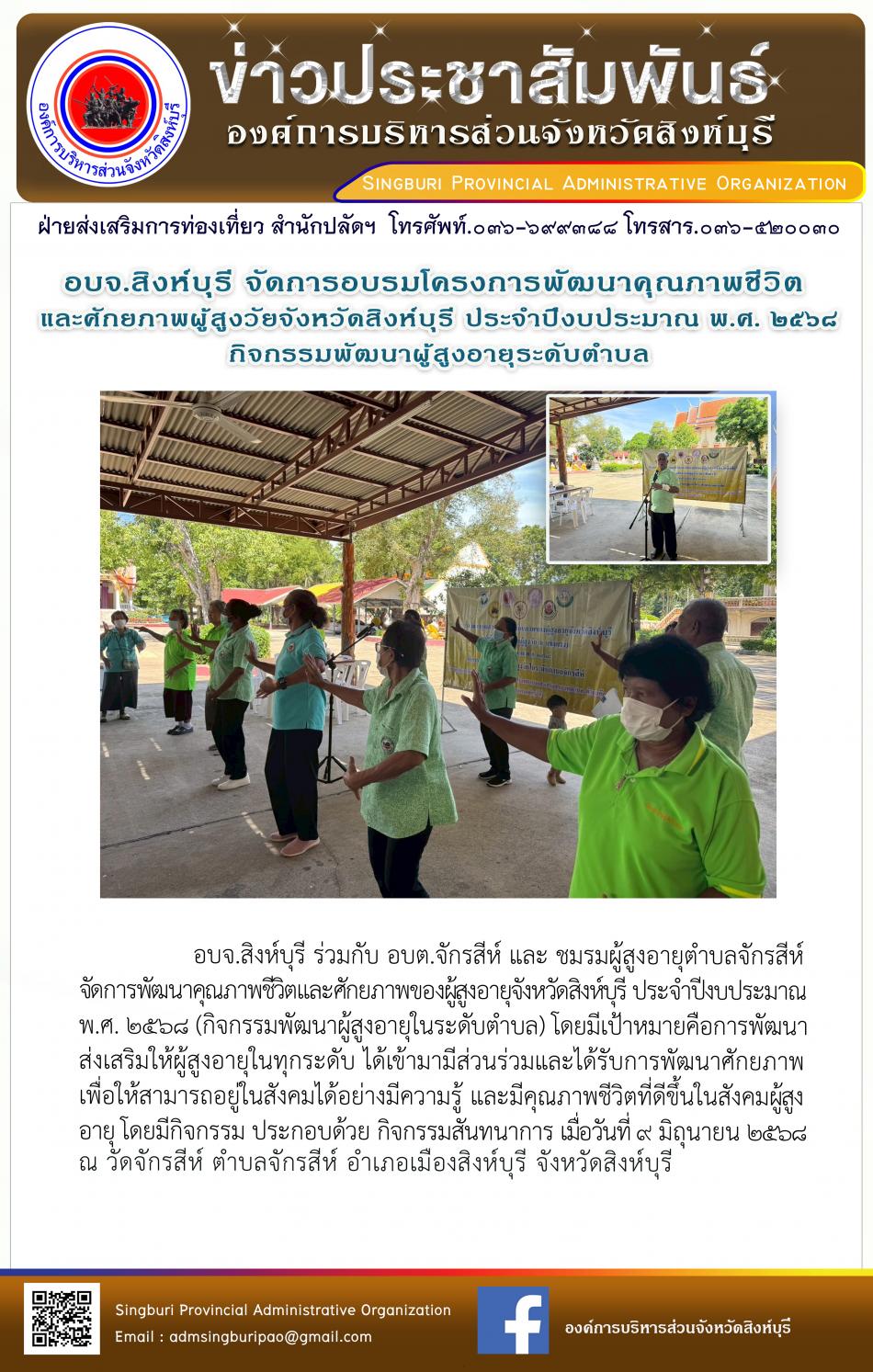 อบจ.สิงห์บุรี จัดโครงการพัฒนาคุณภาพชีวิตและศักยภาพผุ้สูงอายุจังหวัดสิงห์บุรี ประจำปีงบประมาณพ.ศ.2568 กิจกรรมพัฒนาผู้สูงอายุในระดับตำบล [9 มิถุนายน 2568]