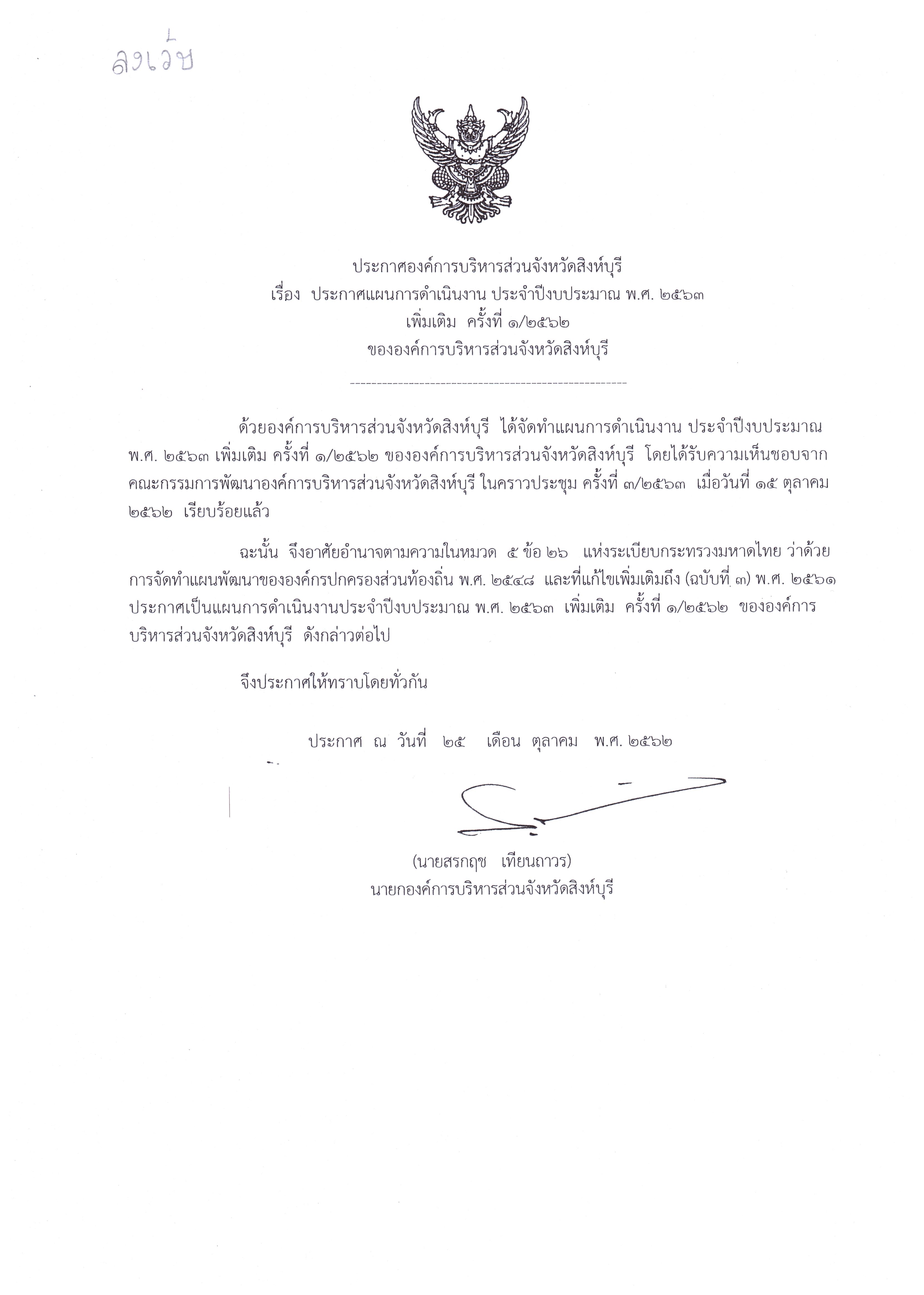 ประกาศองค์การบริหารส่วนจังหวัดสิงห์บุรี เรื่อง ประกาศแผนการดำเนินงาน ประจำปีงบประมาณ พ.ศ.2563 เพิ่มเติม ครั้งที่ 1/2562 ขององค์การบริหารส่วนจังหวัดสิงห์บุรี