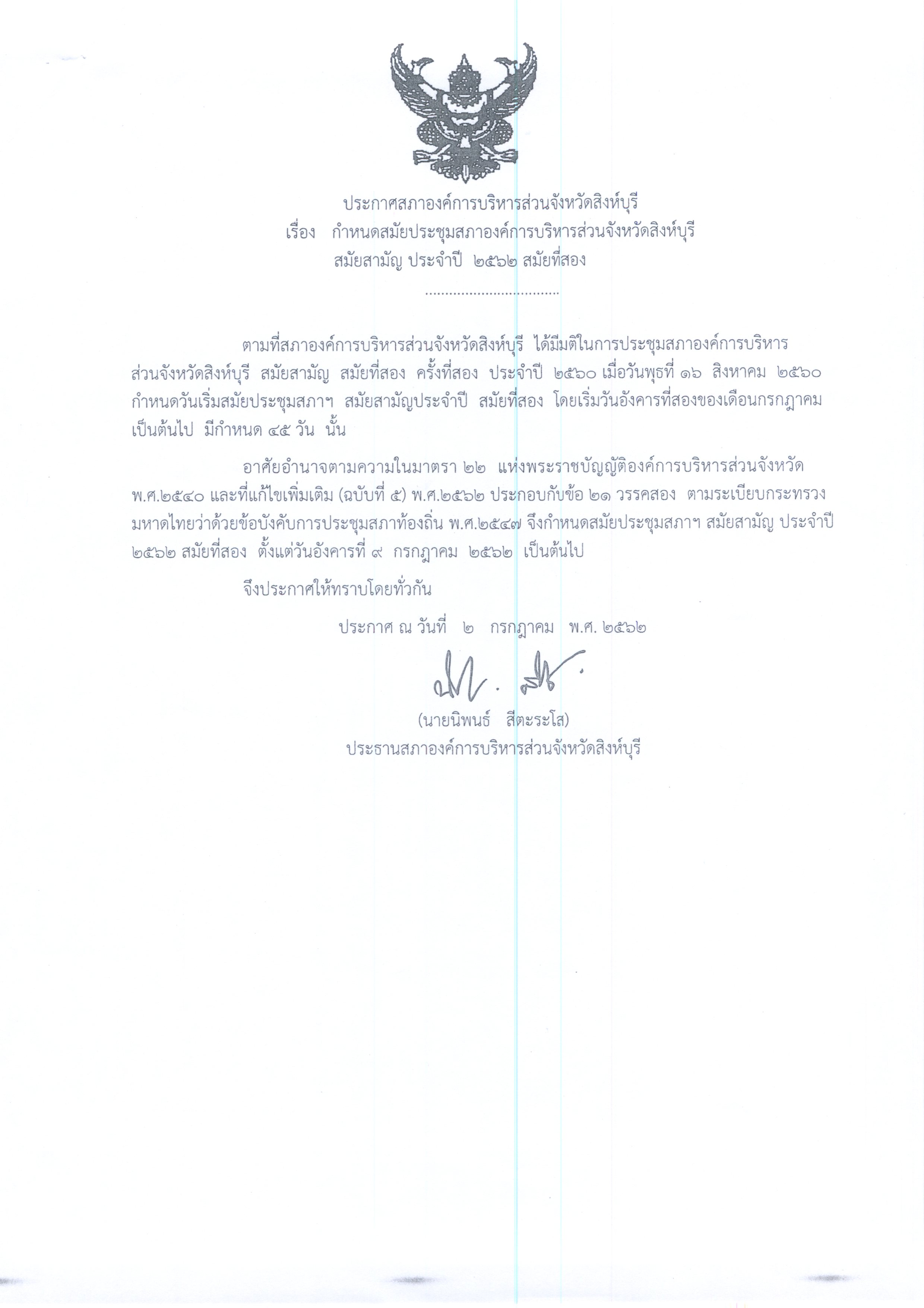 ประกาศองค์การบริหารส่วนจังหวัดสิงห์บุรี เรื่อง กำหนดสมัยประชุมสภาองค์การบริหารส่วนจังหวัดสิงห์บุรี สมัยสามัญ ประจำปี 2562 สมัยที่สอง