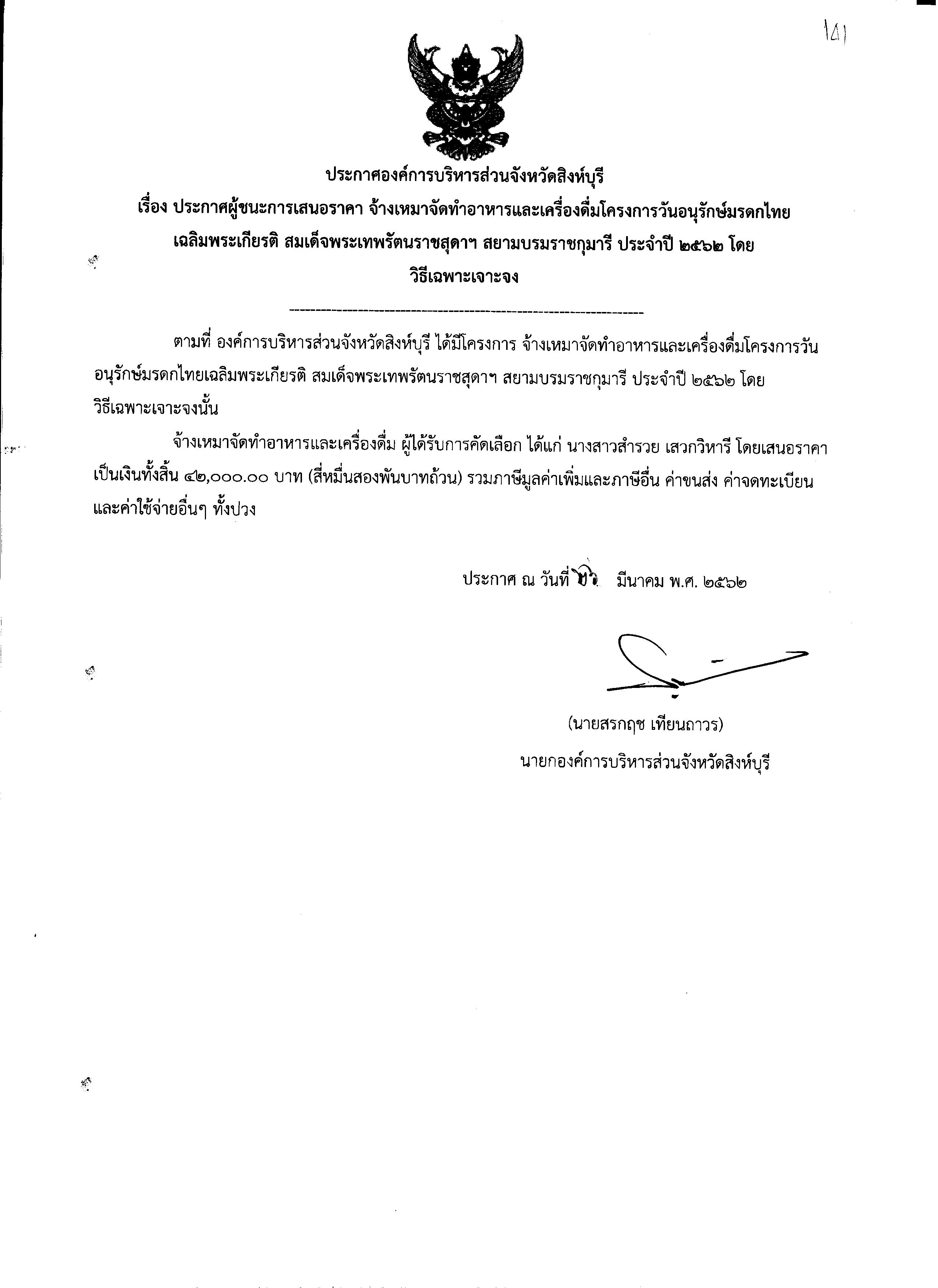 ประกาศผู้ชนะการเสนอราคาจ้างเหมาจัดทำอาหารและเครื่องดื่มโครงการวันอนุรักษ์มรดกไทยฯ ประจำปี 2562 โดยวิธีเฉพาะเจาะจง