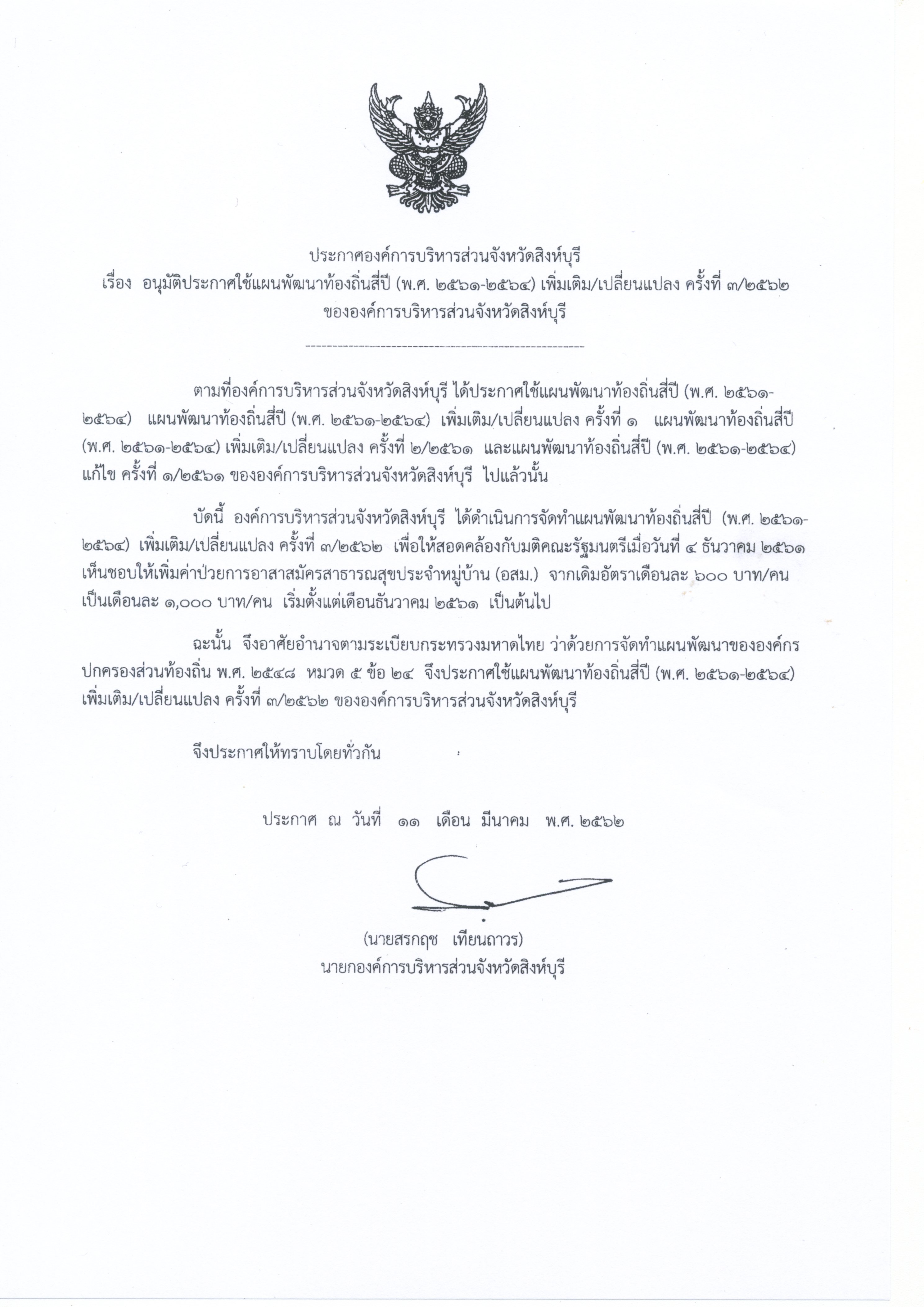 ชื่อเรื่อง : ประกาศองค์การบริหารส่วนจังหวัดสิงห์บุรี เรื่อง อนุมัติประกาศใช้แผนพัฒนาท้องถิ่นสี่ปี (พ.ศ.2561-2564) เพิ่มเติม/เปลี่ยนแปลง ครั้งที่ 3/2562 ขององค์การบริหารส่วนจังหวัดสิงห์บุรี