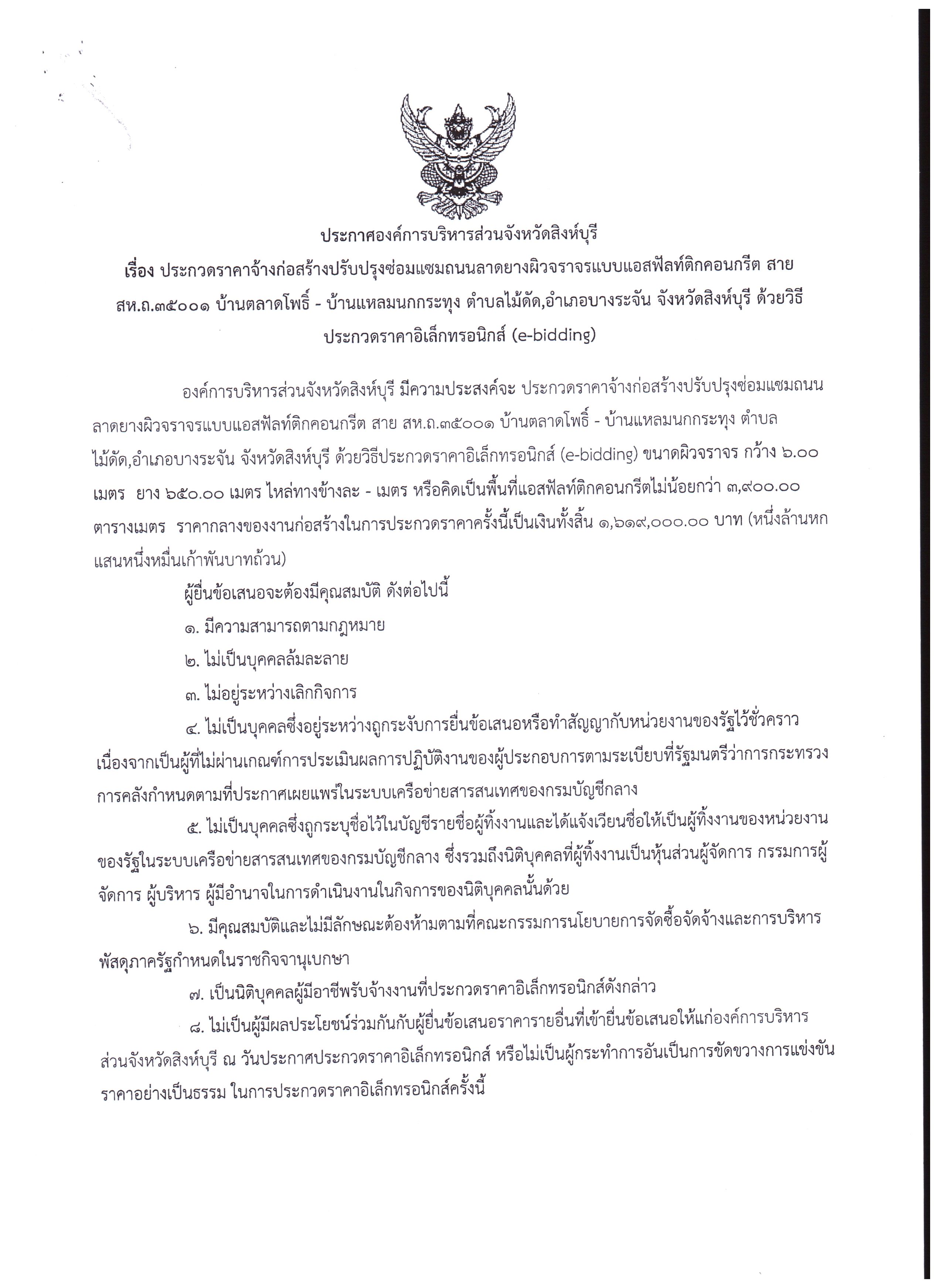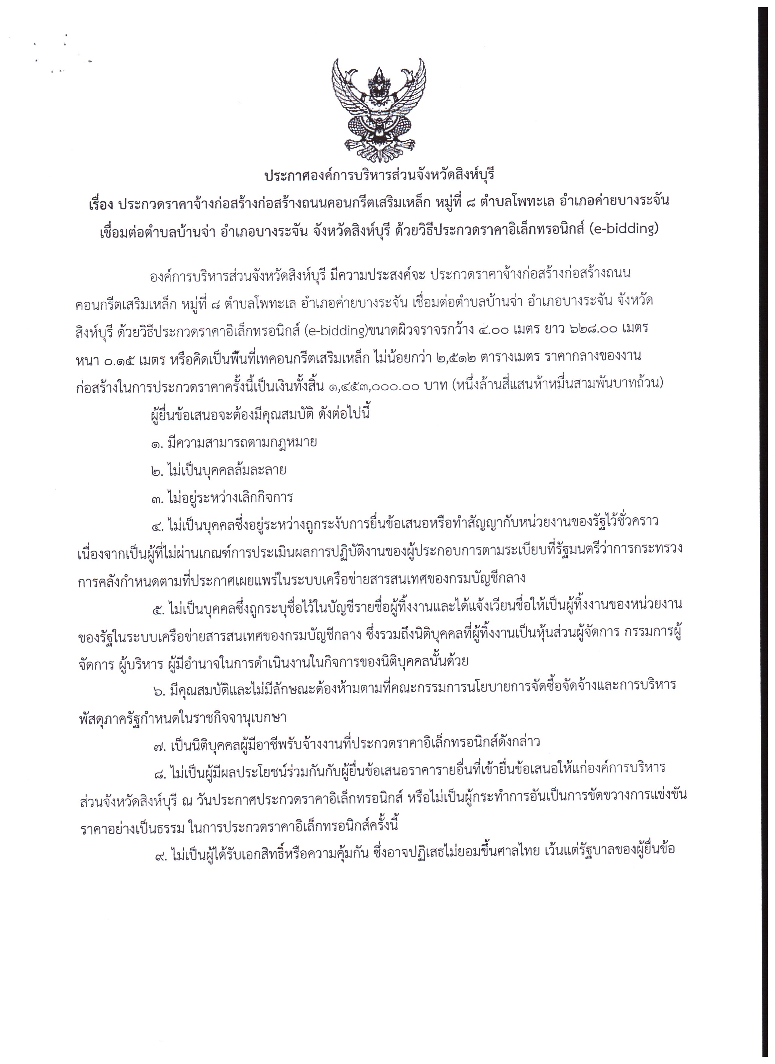 ประกาศองค์การบริหารส่วนจังหวัดสิงห์บุรี 2 เรื่อง ประกวดราคาจ้างก่อสร้าง