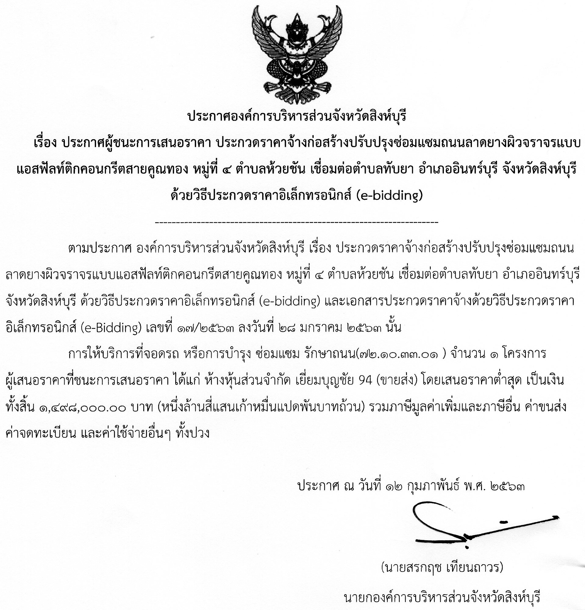 ชื่อเรื่อง : ประกาศองค์การบริหารส่วนจังหวัดสิงห์บุรี เรื่อง ประกาศผู้ชนะการเสนอราคาก่อสร้างปรับปรุงซ่อมแซมถนนลาดยางผิวจราจรแบบแอสฟัลท์ติกคอนกรีต หมู่ที่ 4 ตำบลห้วยชัน เชื่อมต่อ ตำบลทับยา อำเภออินทร์บุรี จังหวัดสิงห์บุรี
