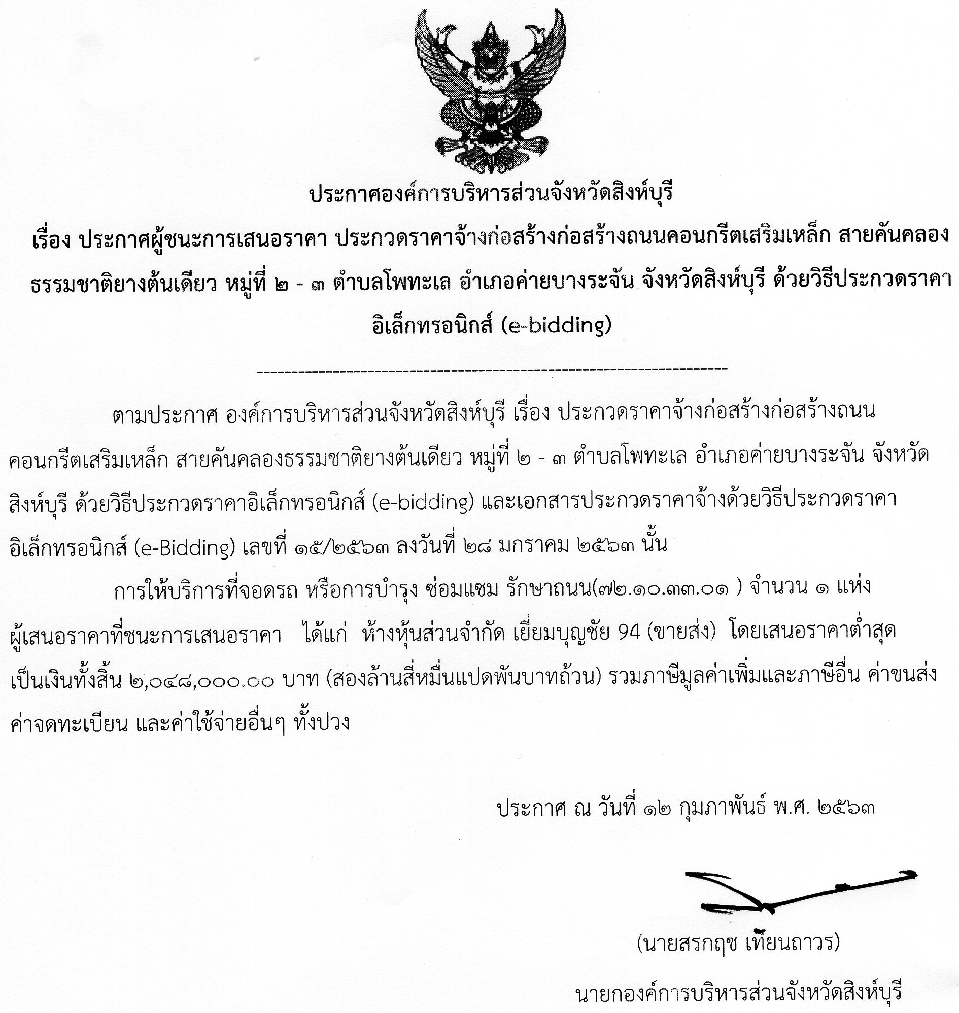 ชื่อเรื่อง : ประกาศองค์การบริหารส่วนจังหวัดสิงห์บุรี เรื่อง ประกาศผู้ชนะการเสนอราคา โครงการก่อสร้างถนนคอนกรีตเสริมเหล็ก สายคันคลองธรรมชาติยางต้นเดียว หมู่ที่ 2 - 3 ตำบลโพทะเล อำเภอค่ายบางระจัน จังหวัดสิงห์บุรี