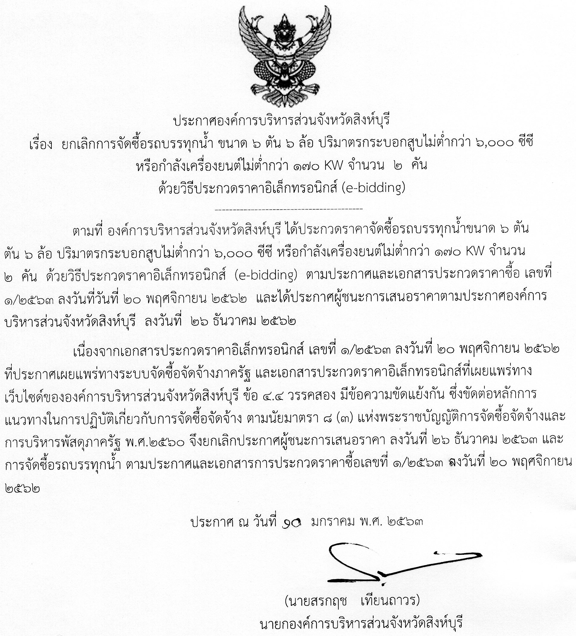 ประกาศองค์การบริหารส่วนจังหวัดสิงห์บุรี เรื่องประกาศยกเลิกการจัดซื้อรถบรรทุกน้ำ ขนาด6 ตัน 6 ล้อ จำนวน 2 คัน