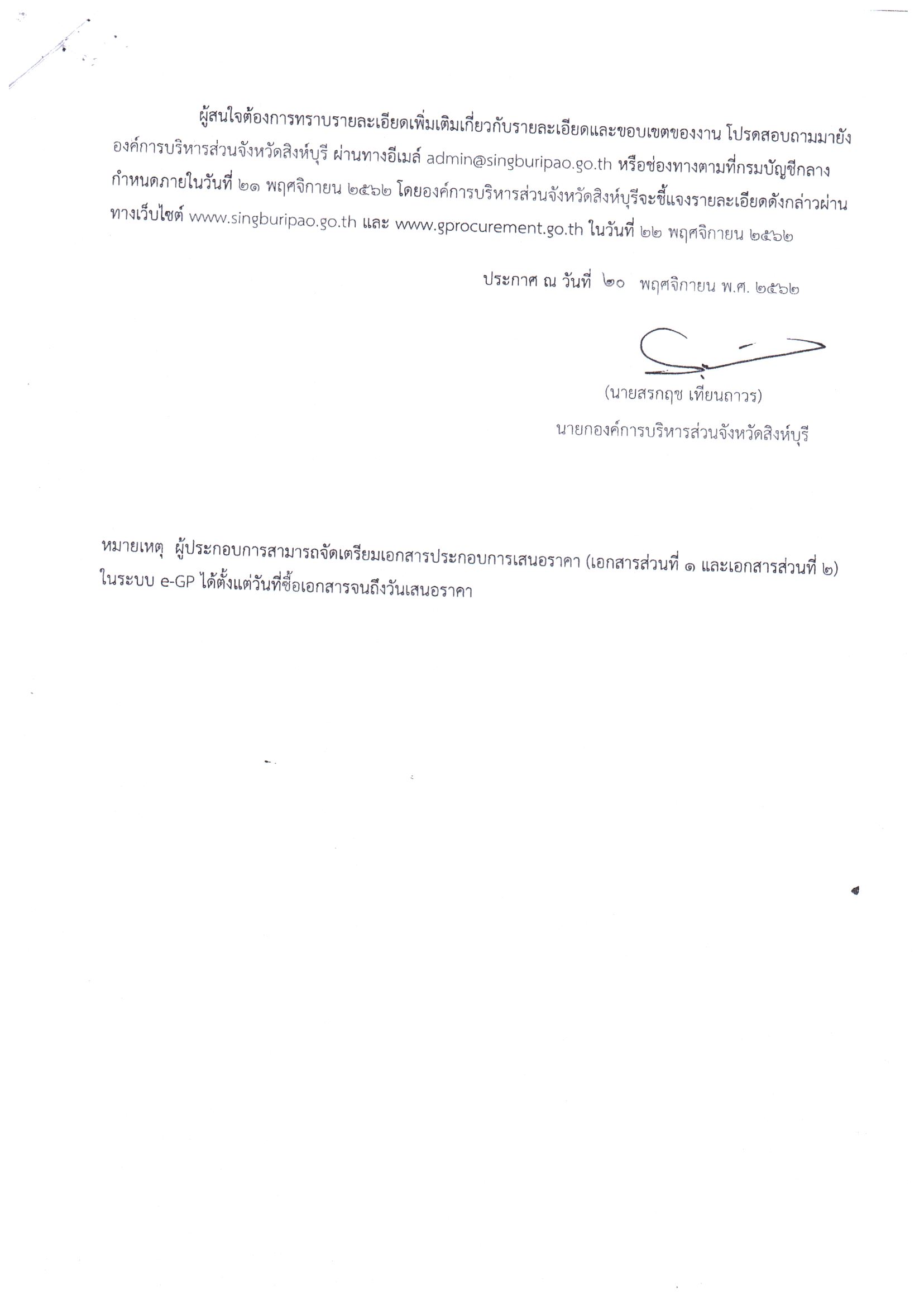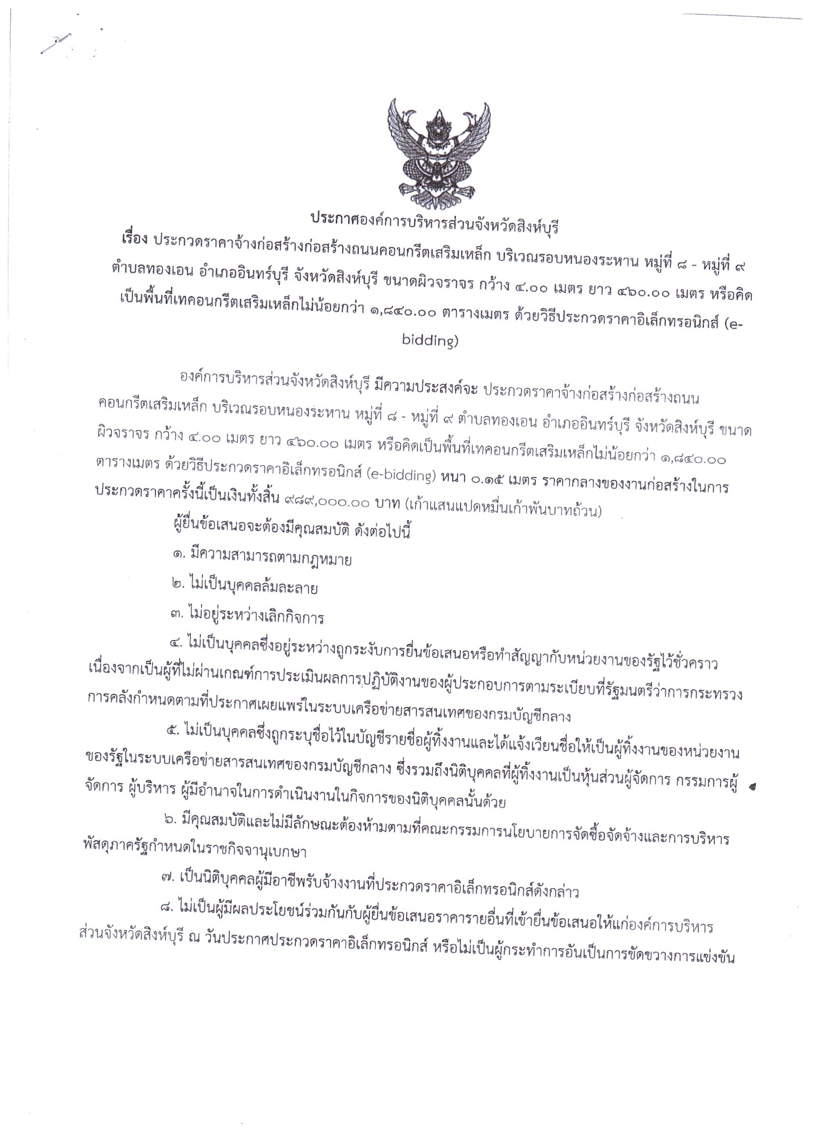 ประกาศองค์การบริหารส่วนจังหวัดสิงห์บุรี เรื่อง ประกวดราคาจ้างก่อสร้างถนนคอนกรีตเสริมเหล็ก บริเวณรอบหนองระหาน ม.8 - ม.9 ต.ทองเอน อ.อินทร์บุรี จ.สิงห์บุรี