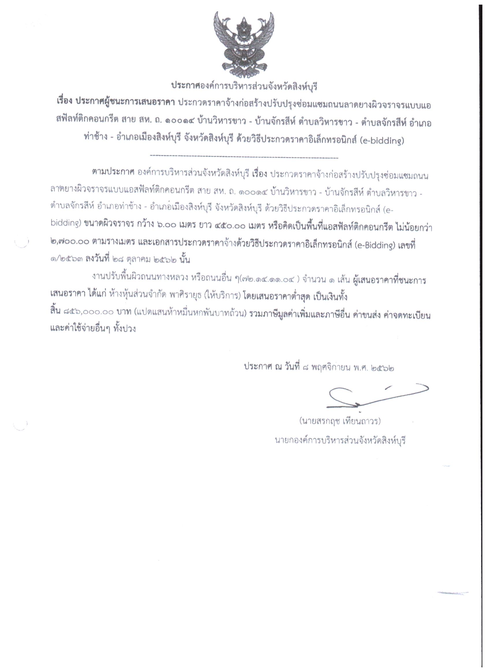 ประกาศองค์การบริหารส่วนจังหวัดสิงห์บุรี เรื่อง ประกาศผู้ชนะการเสนอราคา ถนนสาย สห.ถ.10014 บ้านวิหารขาว - บ้านจักรสีห์