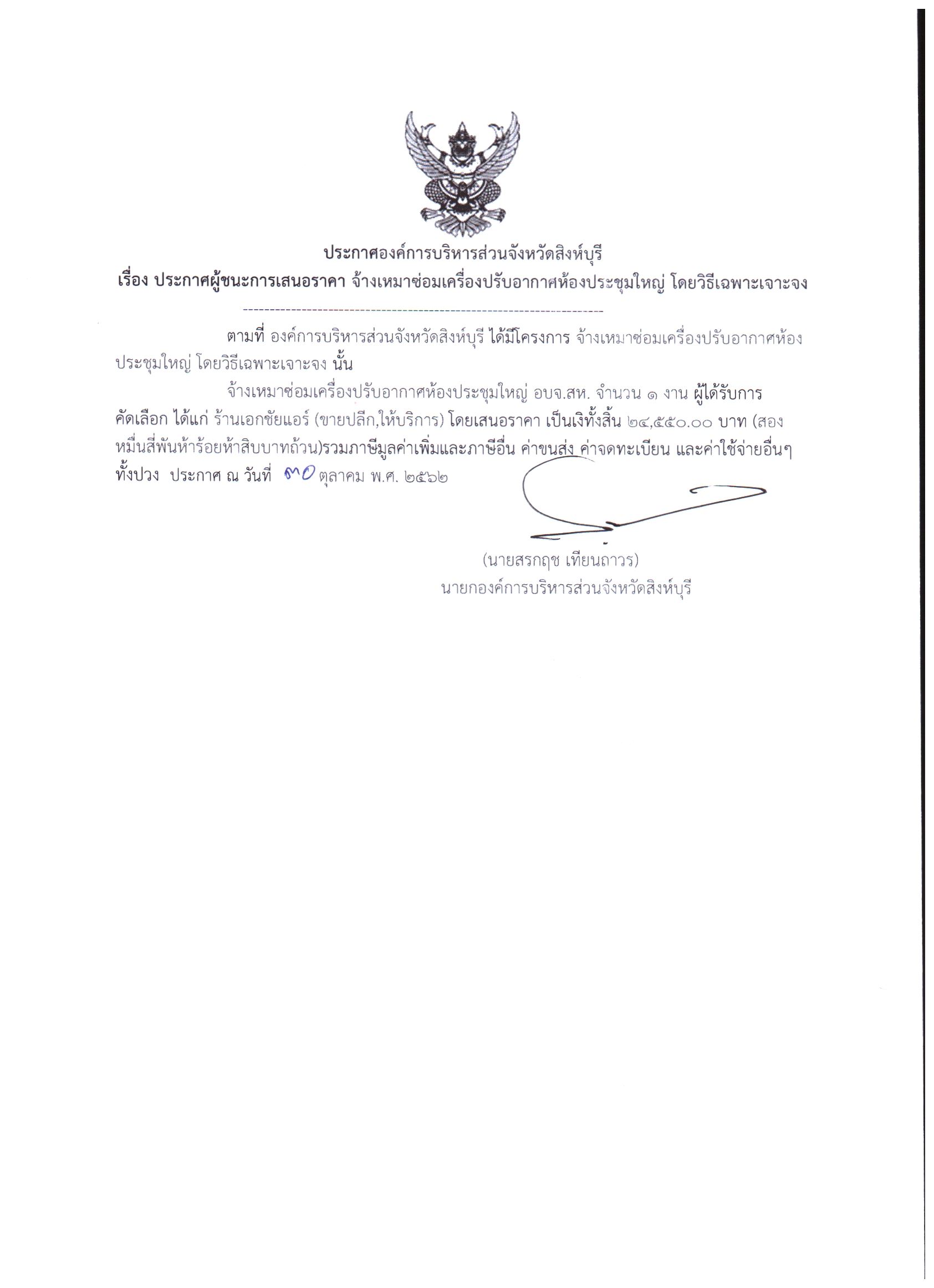 ประกาศองค์การบริหารส่วนจังหวัดสิงห์บุรี เรื่อง ประกาศผู้ชนะการเสนอราคา จ้างเหมาซ่อมเครื่องปรับอากาศห้องประชุมใหญ่