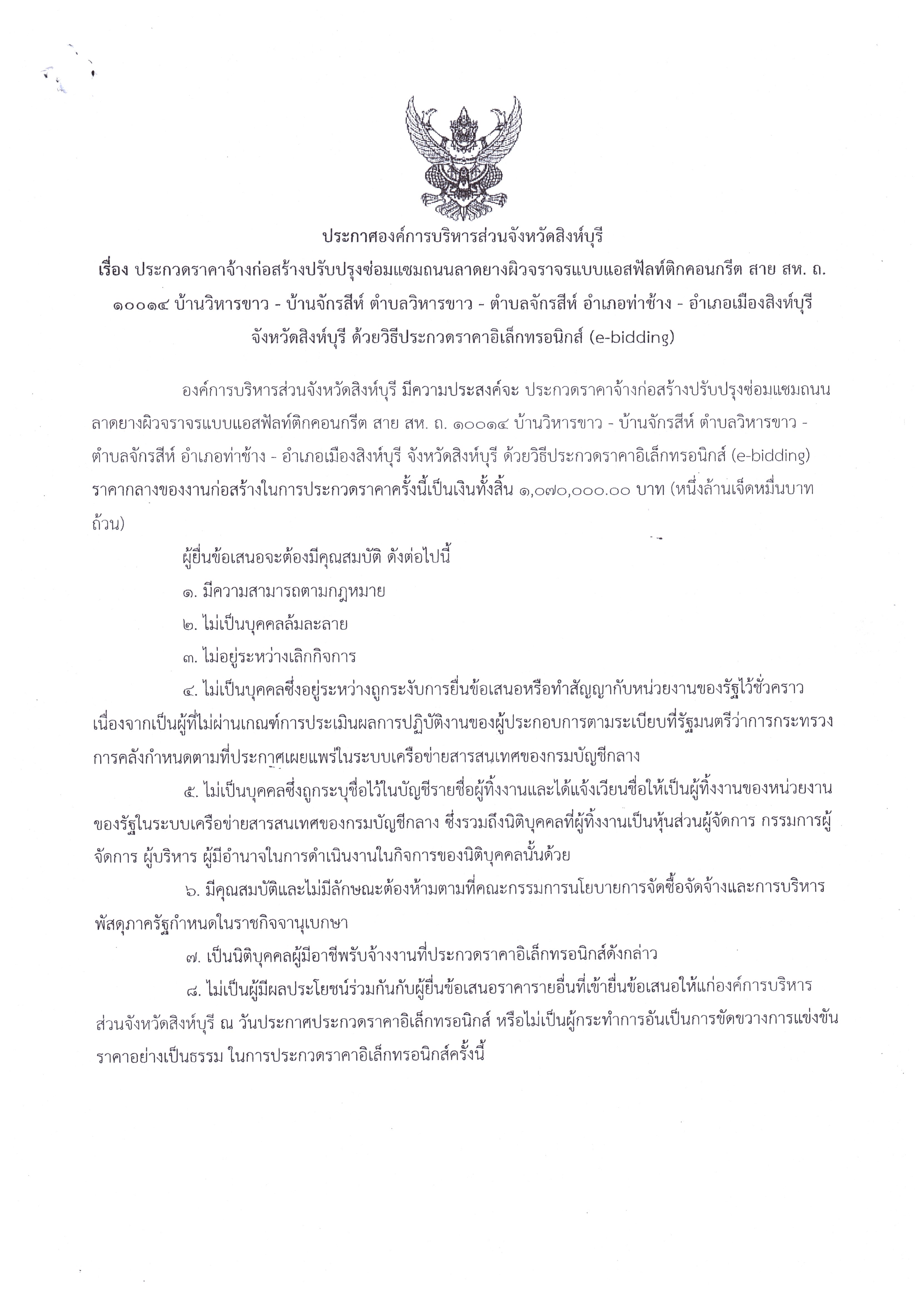 ประกาศองค์การบริหารส่วนจังหวัดสิงห์บุรี เรื่อง ประกวดราคาจ้างก่อสร้างปรับปรุงซ่อมแซมถนนลาดยางผิวจราจรแบบแอสฟัลท์ติกคอนกรีต สาย สห.ถ.10014