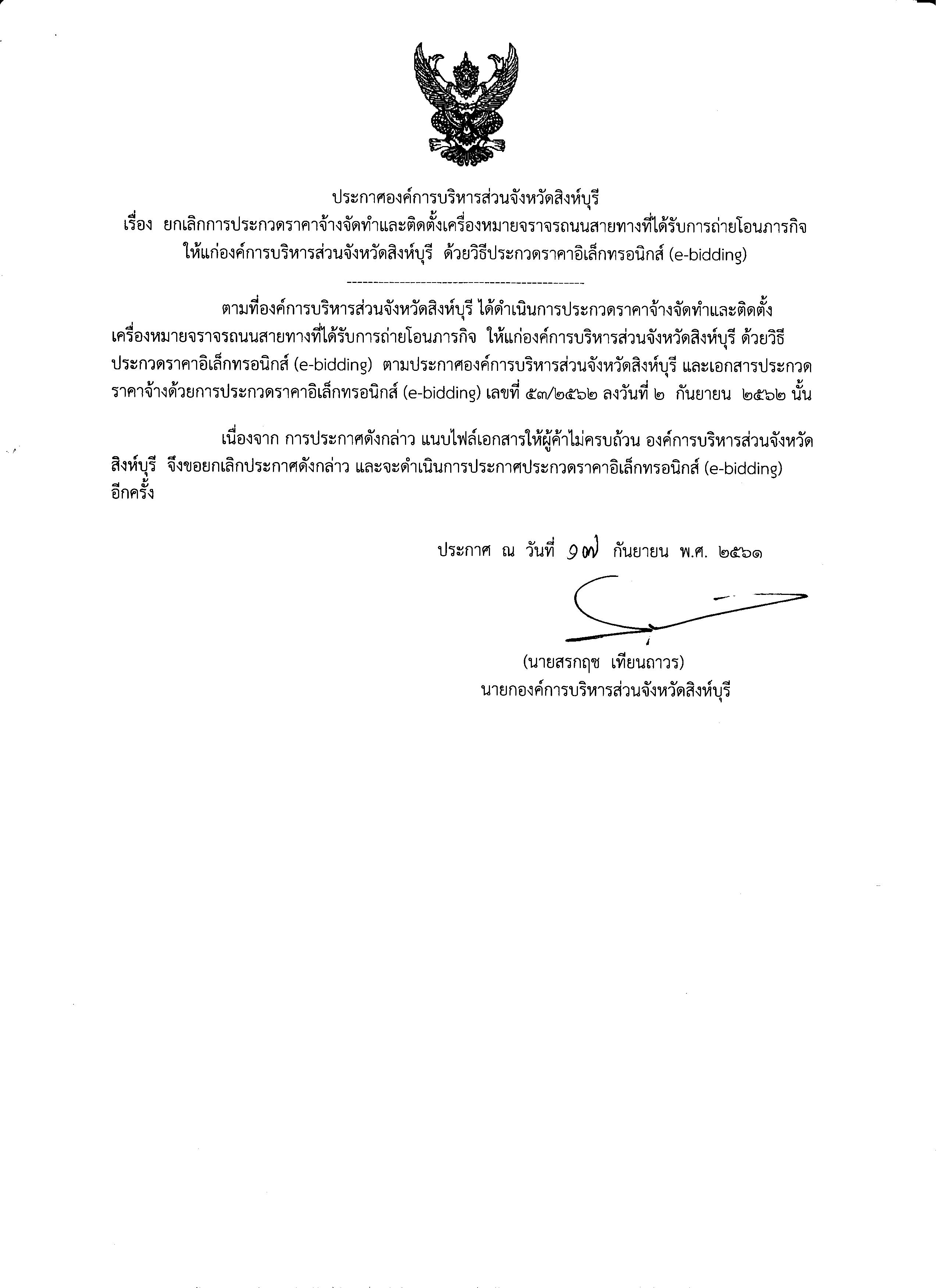 ประกาศองค์การบริหารส่วนจังหวัดสิงห์บุรี เรื่อง ยกเลิกการประกวดราคาจัดทำและติดตั้งเครื่องหมายจราจรถนนสายทางที่ได้รับการถ่ายโอนภารกิจฯ