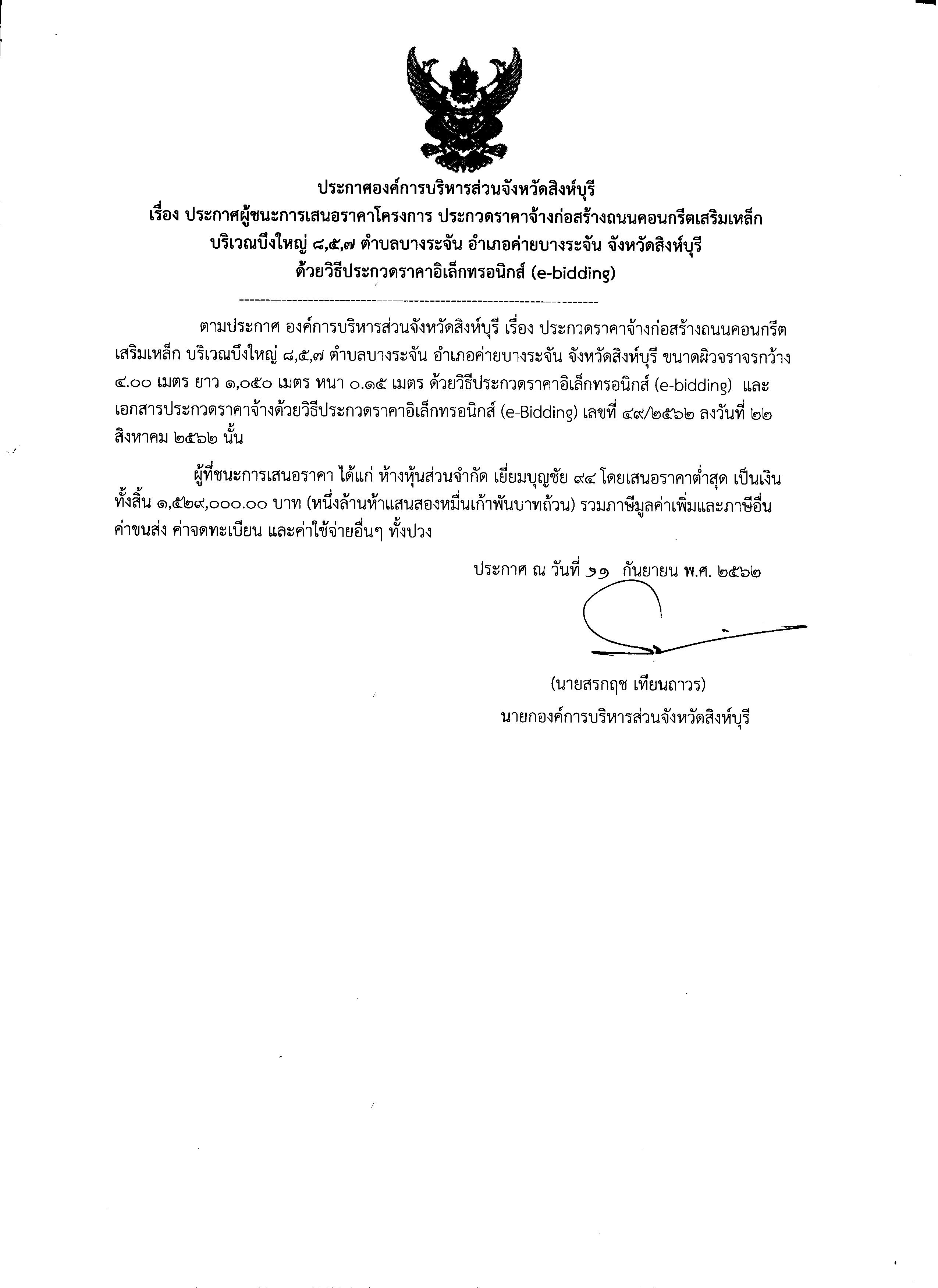 ประกาศองค์การบริหารส่วนจังหวัดสิงห์บุรี เรื่อง ประกาศผู้ชนะการเสนอราคาจ้างก่อสร้างถนนคอนกรีตเสริมเหล็ก บริเวณบึงใหญ่ 8,5,4 ตำบลบางระจัน อำเภอค่ายบางระจัน จังหวัดสิงห์บุรี