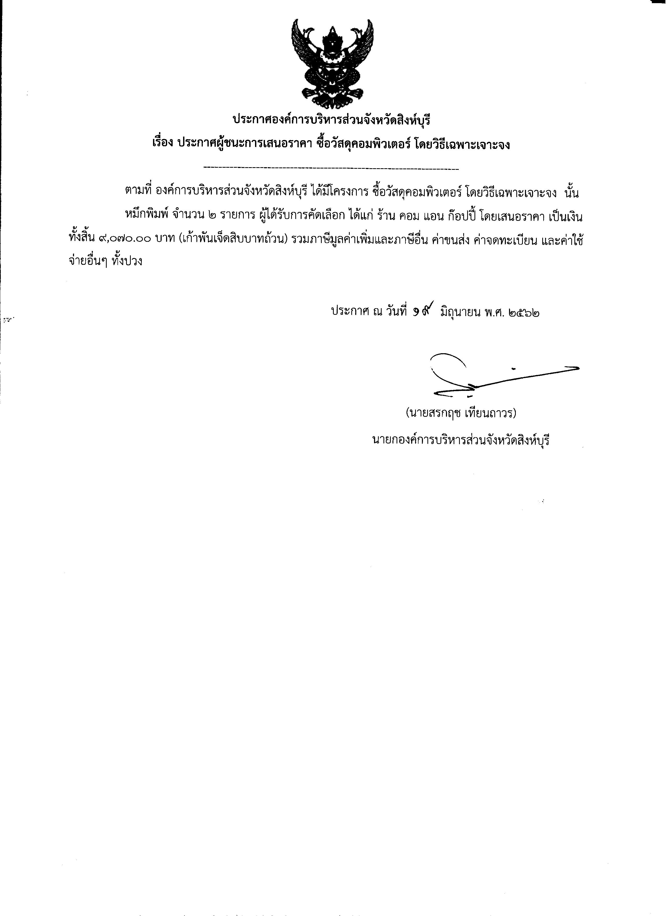 ประกาศองค์การบริหารส่วนจังหวัดสิงห์บุรี เรื่อง ประกาศผู้ชนะการเสนอราคา ซื้อวัสดุคอมพิวเตอร์ โดยวิธีเฉพาะเจาะจง