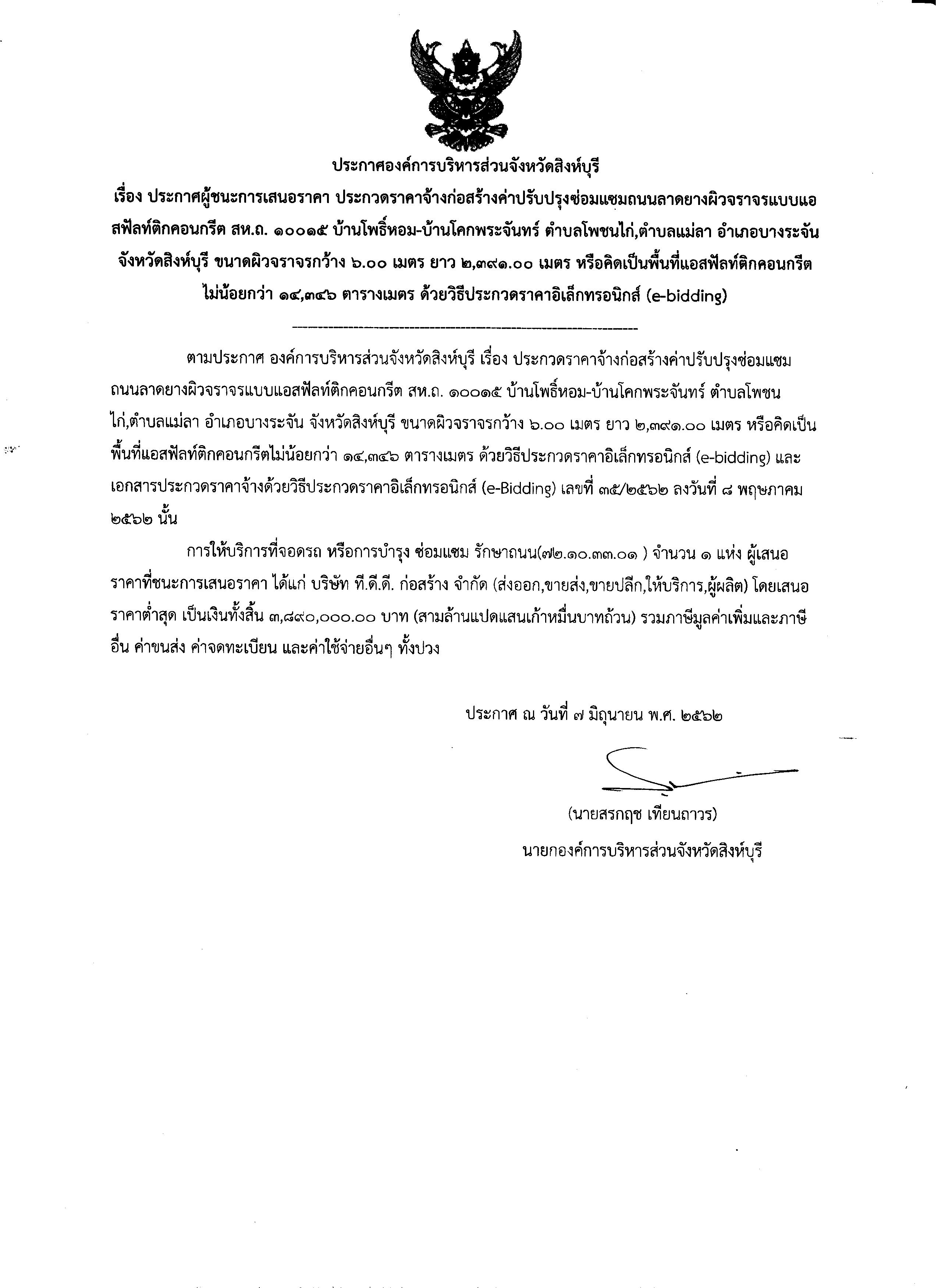 ชื่อเรื่อง : ประกาศองค์การบริหารส่วนจังหวัดสิงห์บุรี เรื่อง ประกาศผู้ชนะการเสนอราคาโครงการปรับปรุงซ่อมแซมถนนลาดยางผิวจราจรแบบแอสฟัลท์ติกคอนกรีต สห.ถ.10015 บ้านโพธิ์หอม - บ้านโคกนางพระจันทร์ ตำบลโพชนไก่,ตำบลแม่ลา อำเภอบางระจัน จังหวัดสิงห์บุรี