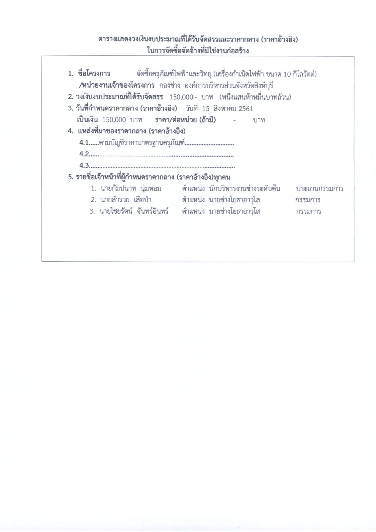 ประกาศองค์การบริหารส่วนจังหวัดสิงห์บุรี เรื่อง จัดซื้อครุภัณฑ์ไฟฟ้าและวิทยุ(เครื่องกำเนิดไฟฟ้า ขนาด 10 กิโลวัตต์)