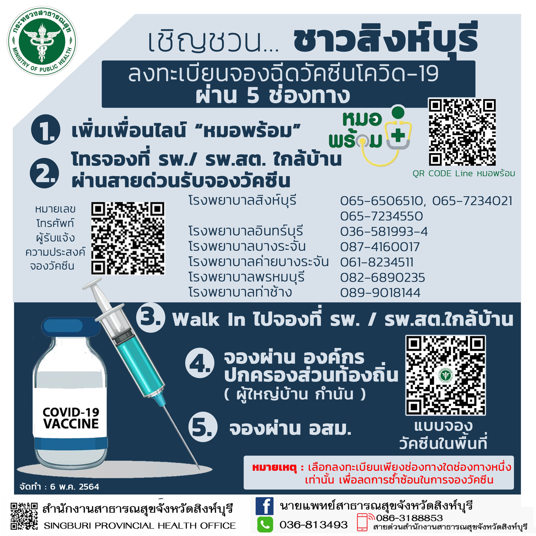 รายละเอียด : อบจ.สิงห์บุรี ขอเชิญชวนประชาชนชาวสิงห์บุรีลงทะเบียนรับวัคซีน Covid-19 ผ่าน 5 ช่องทาง ๆ ได้แก่