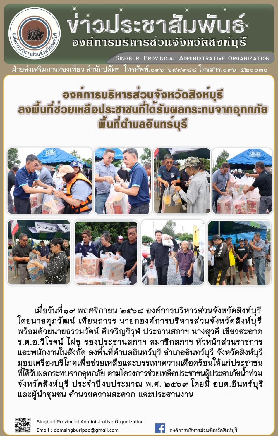 องค์การบริหารส่วนจังหวัดสิงห์บุรี ลงพื้นที่ช่วยเหลือประชาชนที่ได้รับผลกระทบจากอุทกภัย พื้นที่เทศบาลตำบลอินทร์บุรี[19 พฤศจิกายน 2568]