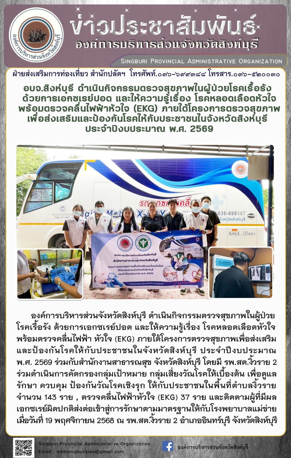 อบจ.สิงห์บุรี ดำเนินกิจกรรม ตรวจสุขภาพในผู้ป่วยโรคเรื้อรังด้วยการเอ็กซเรย์ปอด และให้ความรู้เรื่องโรคหลอดเลือดหัวใจพร้อมตรวจคลื่นไฟฟ้าหัวใจ (EKG)...[19 พฤศจิกายน 2568]