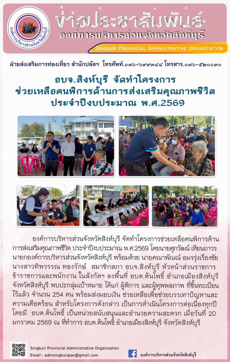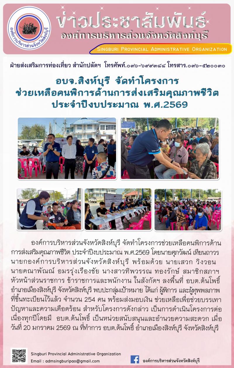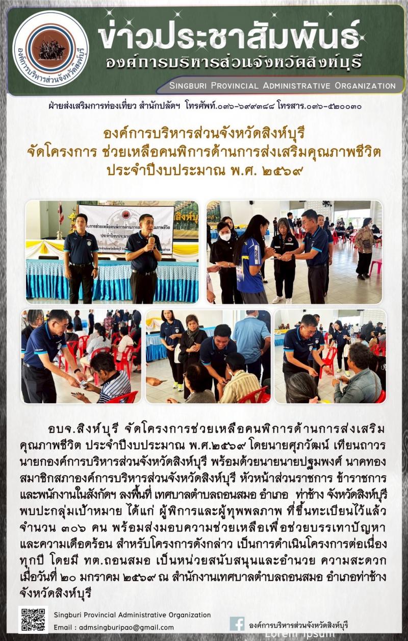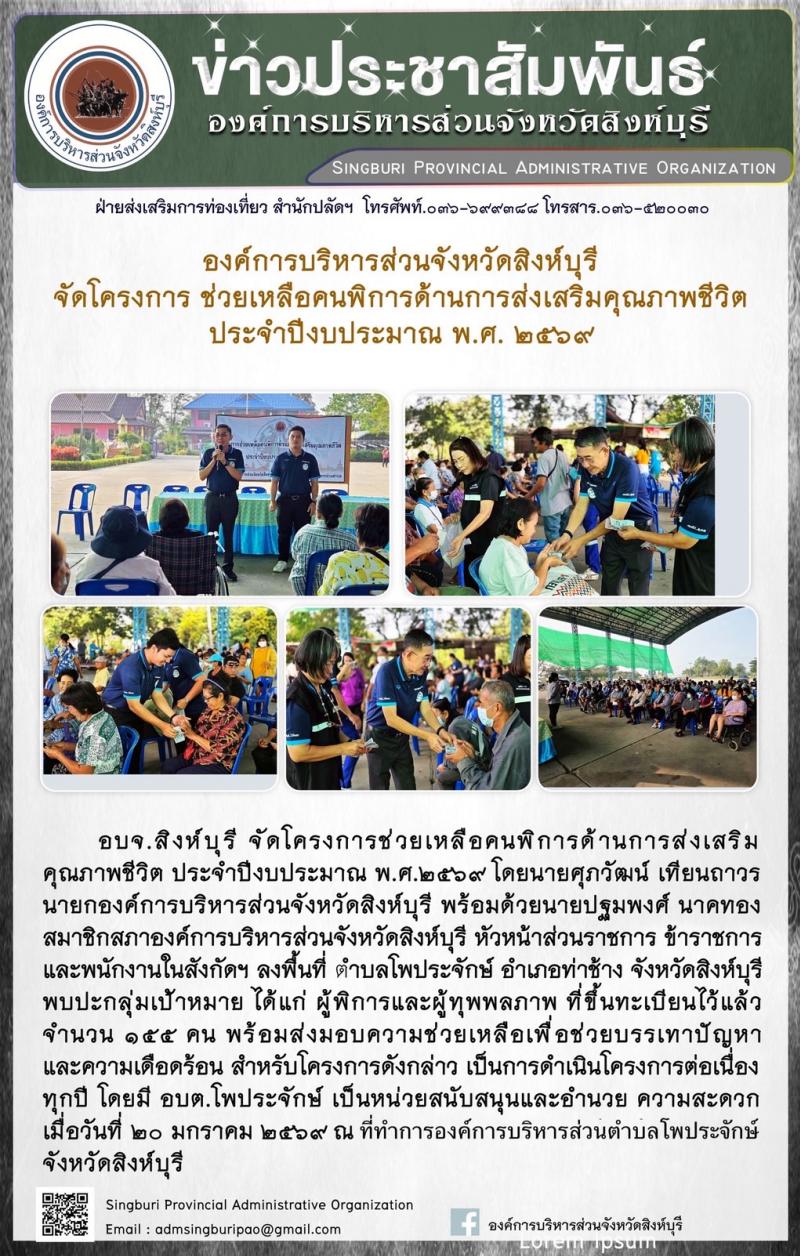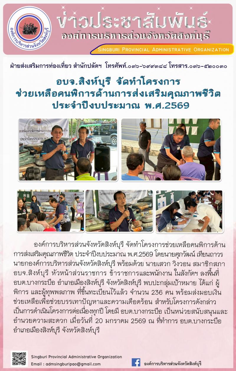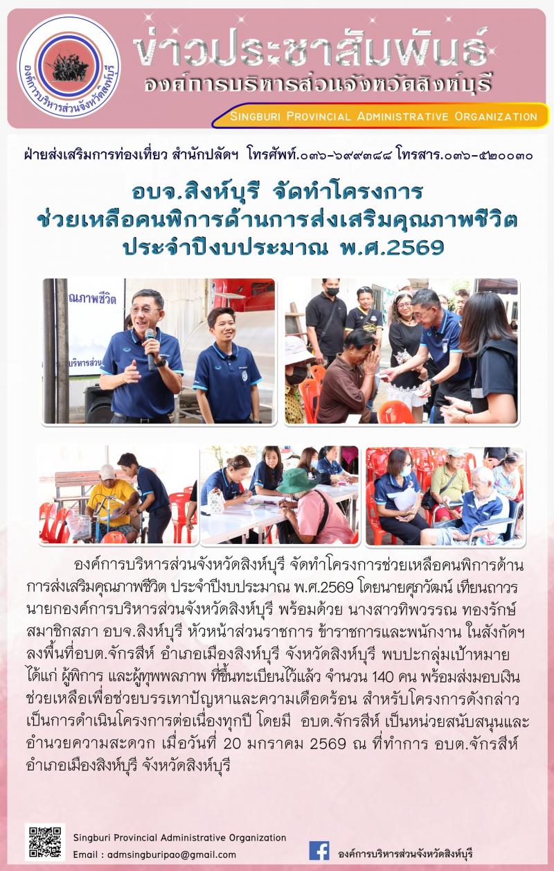 อบจ.สิงห์บุรี จัดโครงการช่วยเหลือคนพิการด้านการส่งเสริมคุณภาพชีวิต ประจำปีงบประมาณ พ.ศี. 2569