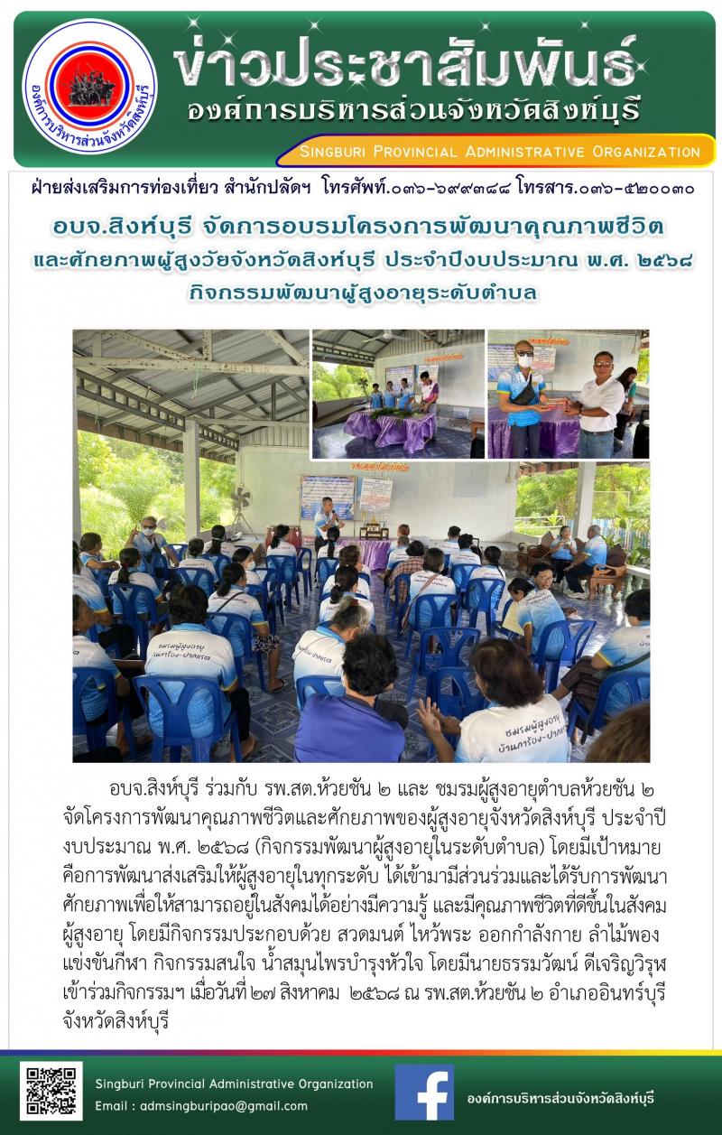 องค์การบริหารส่วนจังหวัดสิงห์บุรี เดำเนินโครงการส่งเสริมสุขภาพและเสริมสร้างคุณค่าผู้สูงอายุจังหวัดสิงห์บุรี
