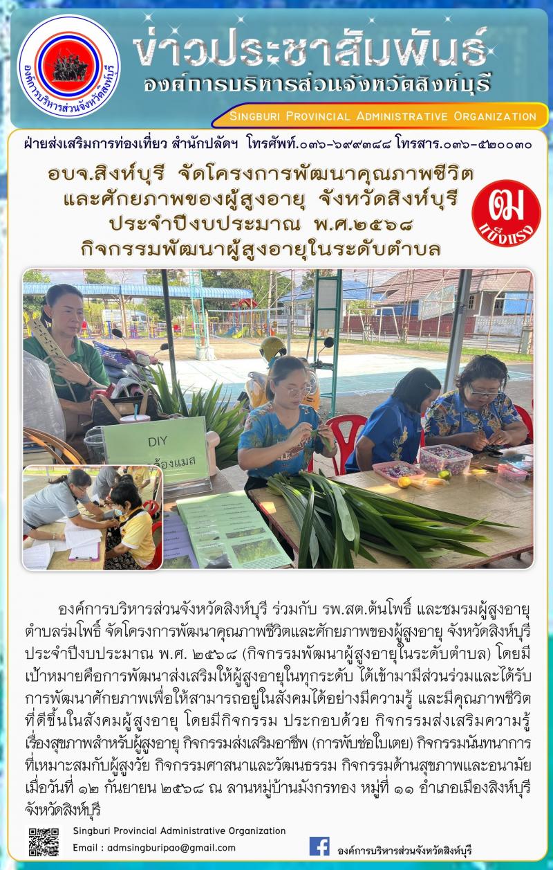 อบจ.สิงห์บุรี จัดโครงการพัฒนาคุณภาพชีวิตและศักยภาพของผู้สูงอายุ จังหวัดสิงห์บุรี ประจำปีงบประมาณ พ.ศ. 2568 กิจกรรมพัฒนาผู้สูงอายุระดับตำบล