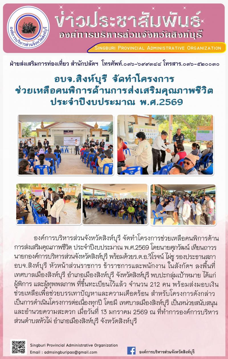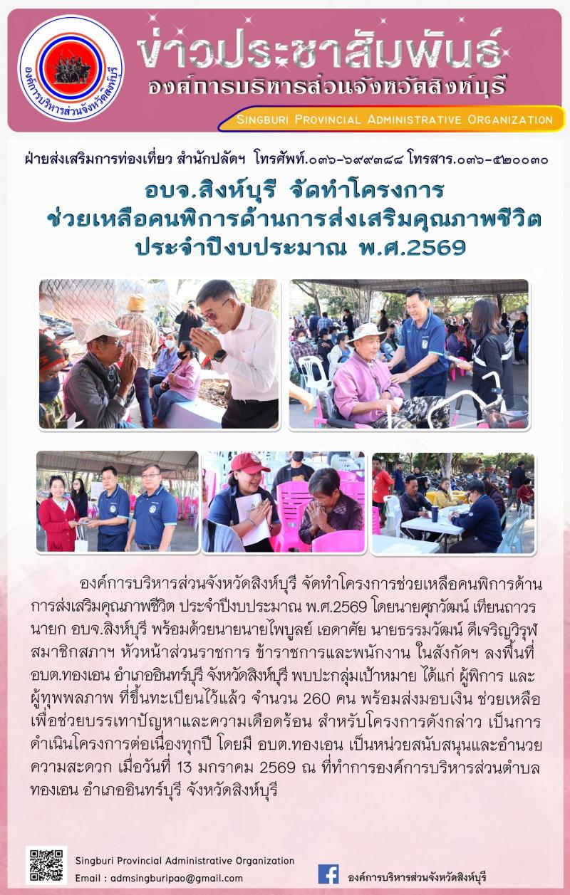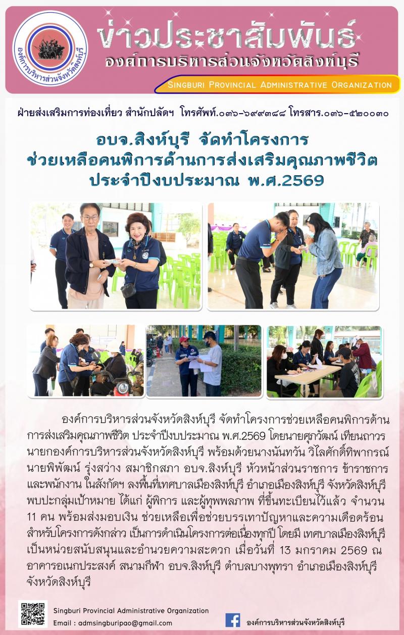 อบจ.สิงห์บุรี จัดทำโครงการช่วยเหลือคนพิการด้านการส่งเสริมคนคุณภาพชีวิต ประจำปีงบประมาณ พ.ศ.2569