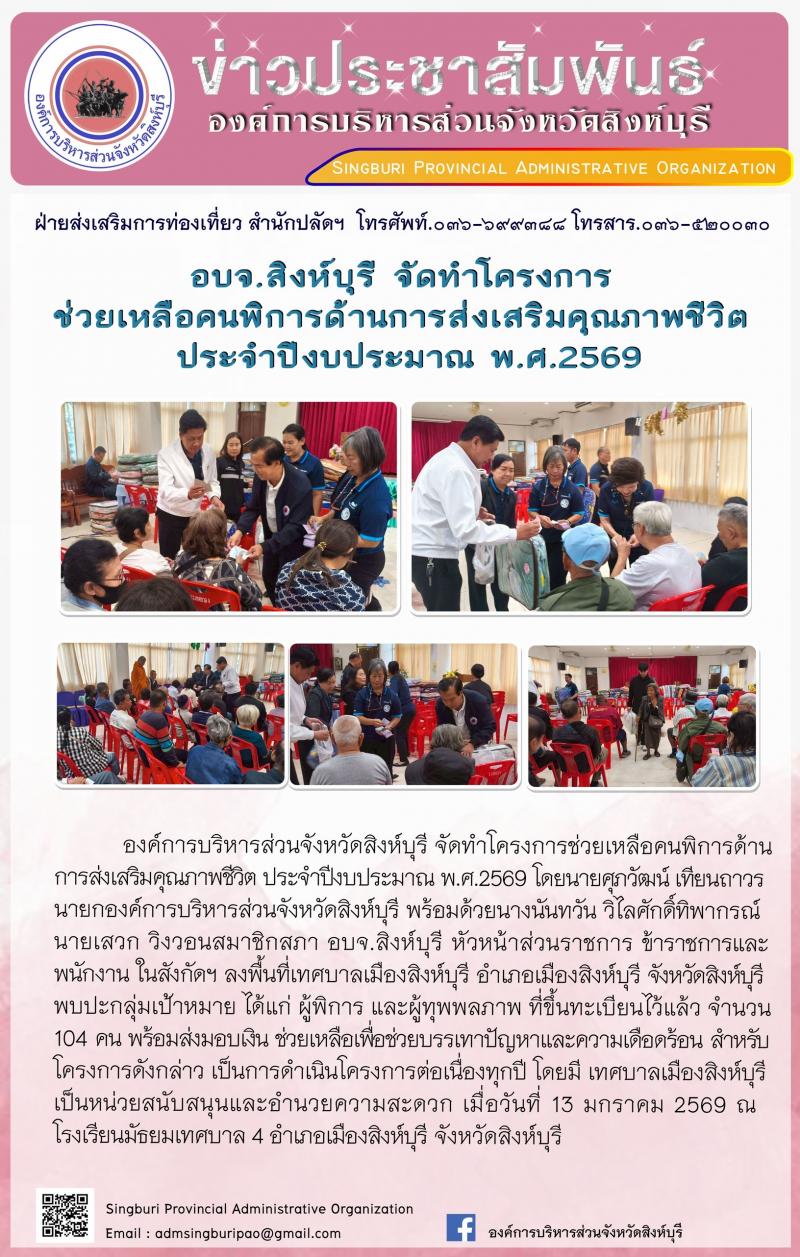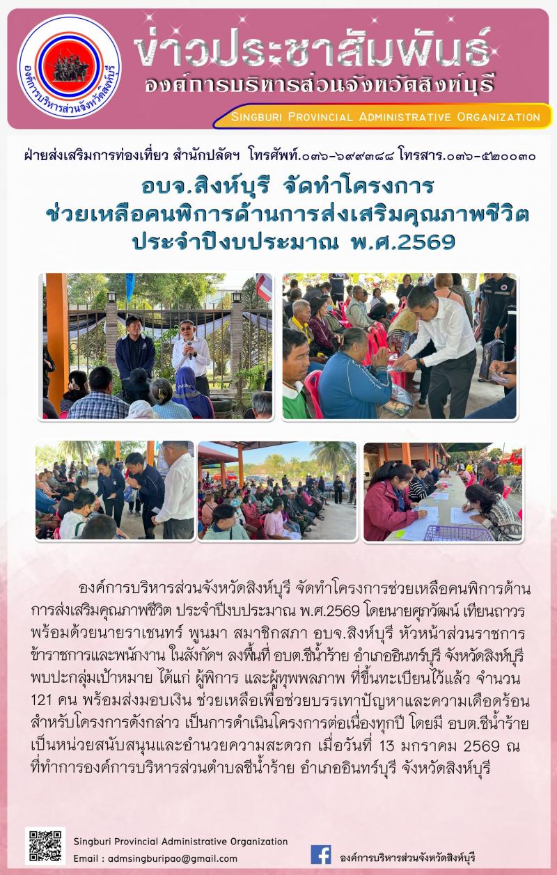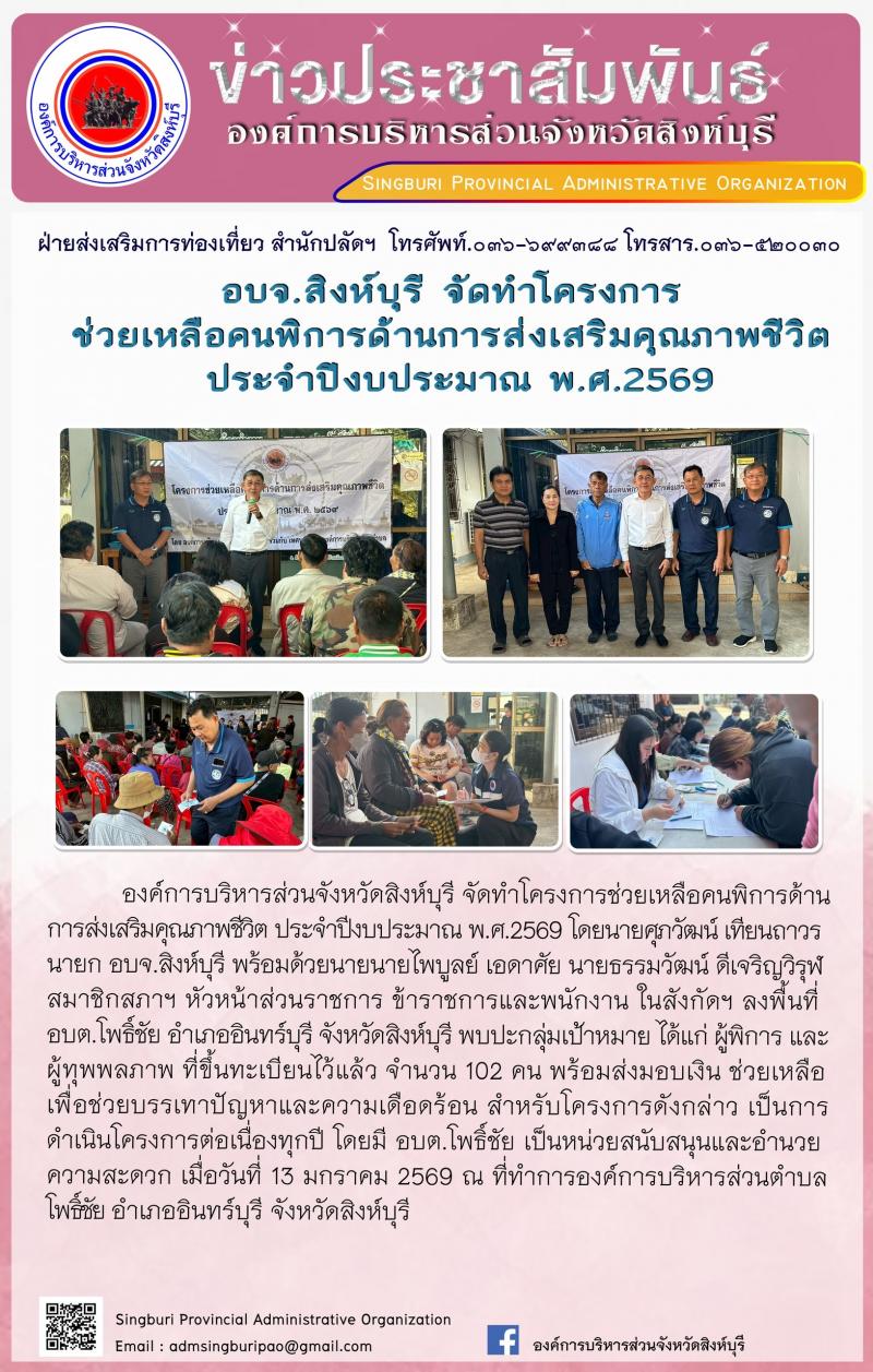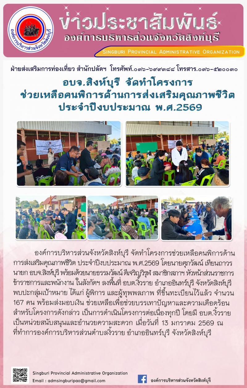 อบจ.สิงห์บุรี จัดทำโครงการช่วยเหลือคนพิการด้านการส่งเสริมคนคุณภาพชีวิต ประจำปีงบประมาณ พ.ศ.2569