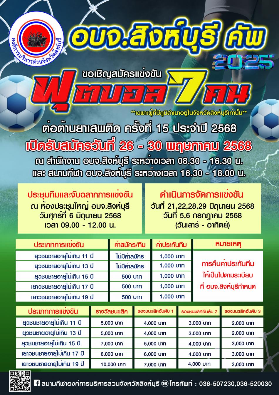 การแข่งขันฟุตบอล ๗ คน “อบจ.สิงห์บุรี คัพ” ต่อต้านยาเสพติด ครั้งที่ ๑๕ ประจำปี ๒๕๖๘