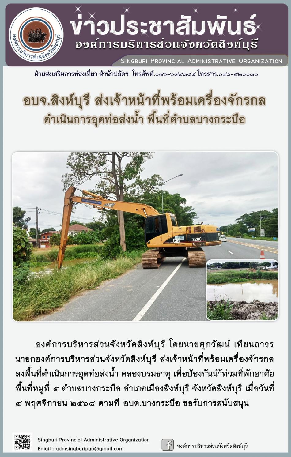 อบจ. สิงห์บุรี ส่งเจ้าหน้าที่พร้อมเครื่องจักรกล ดำเนินการอุดท่อส่งน้ำ พื้นทีตำบลบางกระบือ [4 พฤศจิกายน 2568]