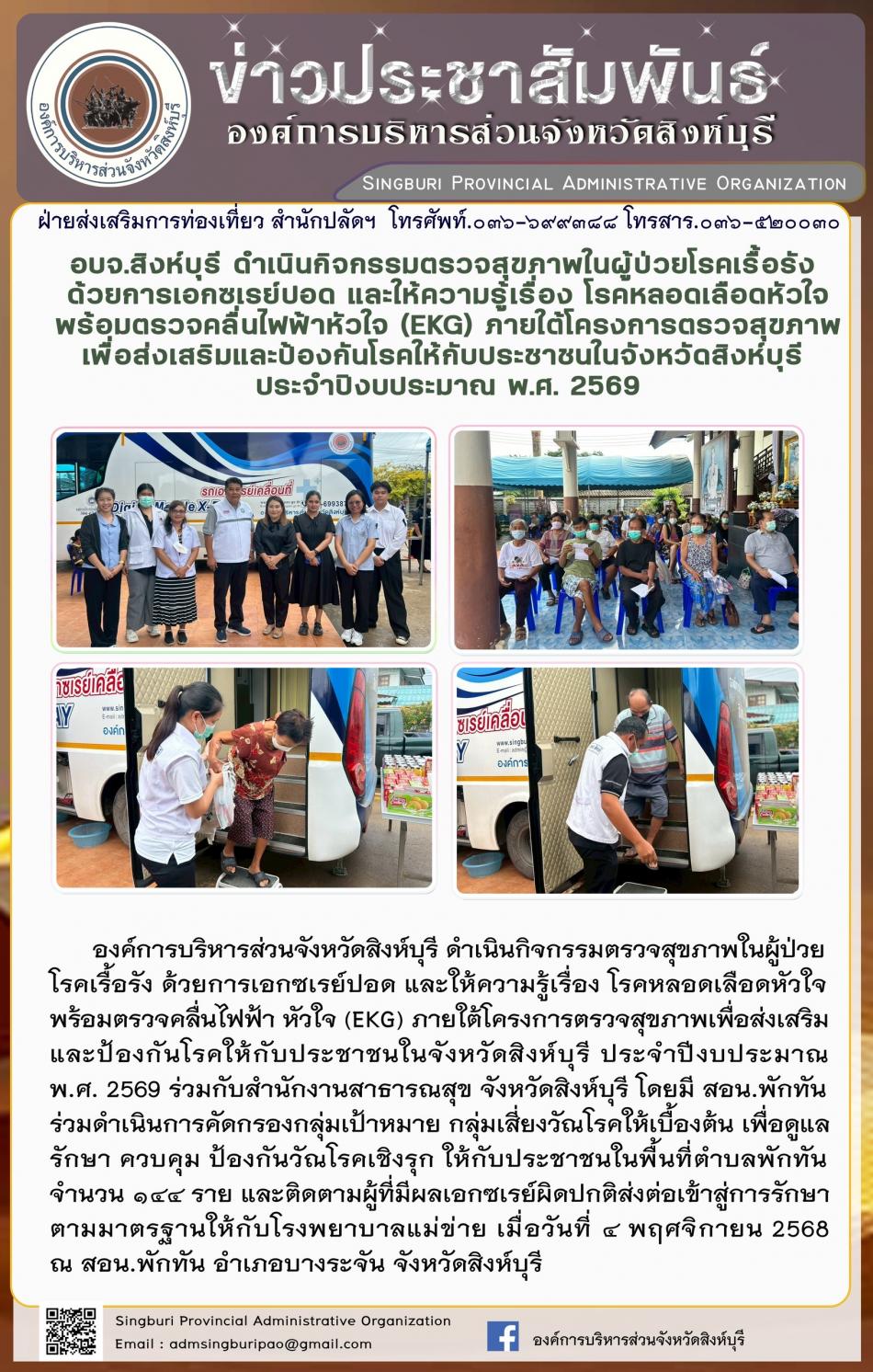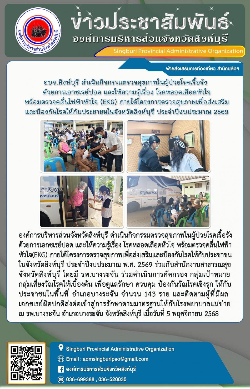 อบจ.สิงห์บุรี ดำเนินกิจกรรมตรวจสุขภาพในผู้ป่วยโรคเรื้อรังด้วยการเอกซเรย์ปอดและให้ความรู้เรื่องโรคหลอด เลือดหัวใจพร้อมตรวจคลื่นไฟฟ้าหัวใจ ( EKG)... [5 พฤศจิกายน 2568]