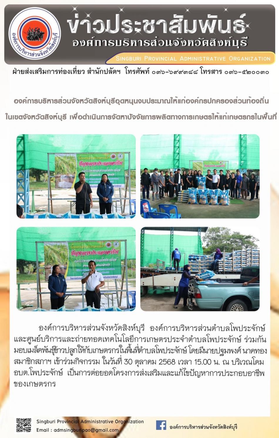 องค์การบริหารส่วนจังหวัดสิงห์บุรีอุดหนุนงบประมาณให้แก่องค์กรปกครองส่วนท้องถิ่นใน เขตจังหวัดสิงห์บุรี เพื่อดำเนินการ จัดหาปัจจัยการผลิตทางการเกษตรให้แก่เกษตรกรในพื้นที่ [30 ตุลาคม 2568]