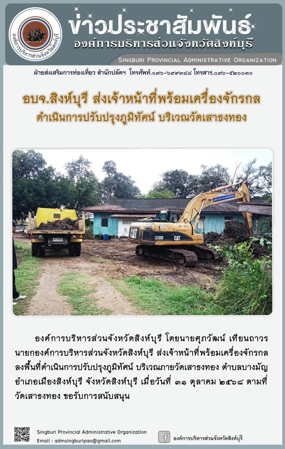 อบจ.สิงห์บุรี ส่งเจ้าหน้าที่พร้อมเครื่องจักรกล ดำเนินการปรับปรุงภูมิทัศน์ บริเวณวัดเสาธงทอง [31 ตุลาคม 2568]