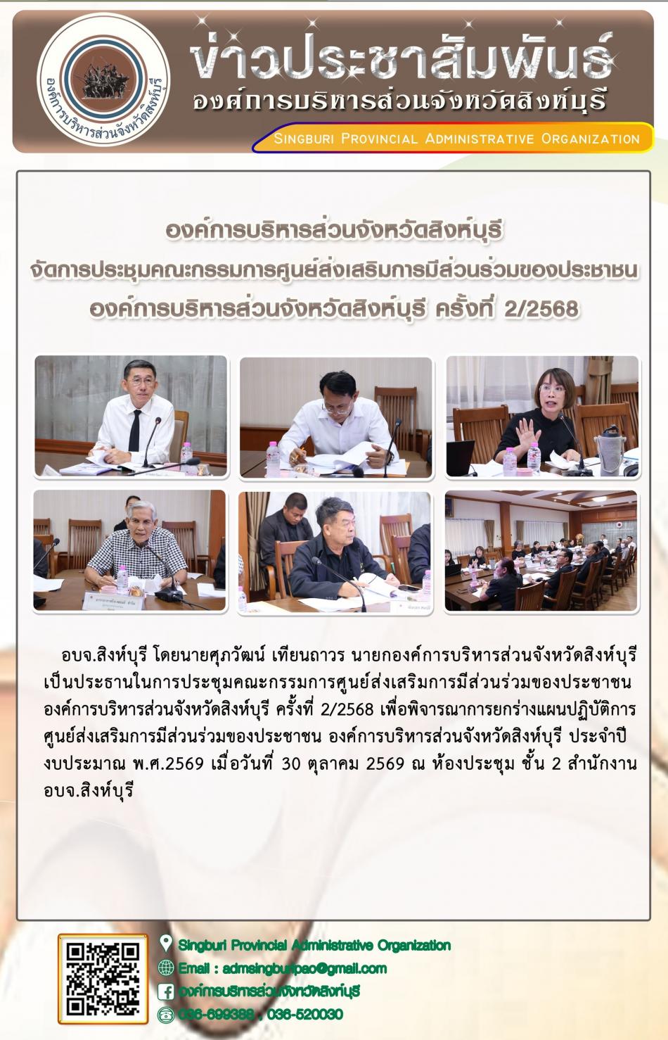 องค์การบริหารส่วนจังหวัดสิงห์บุรี จัดการประชุมคณะกรรมการศูนย์ส่งเสริมการมีส่วนร่วมของประชาชนองค์การบริหารส่วนจังหวัดสิงห์บุรี ครั้งที่ 2/2568 [30 ตุลาคม 2568]
