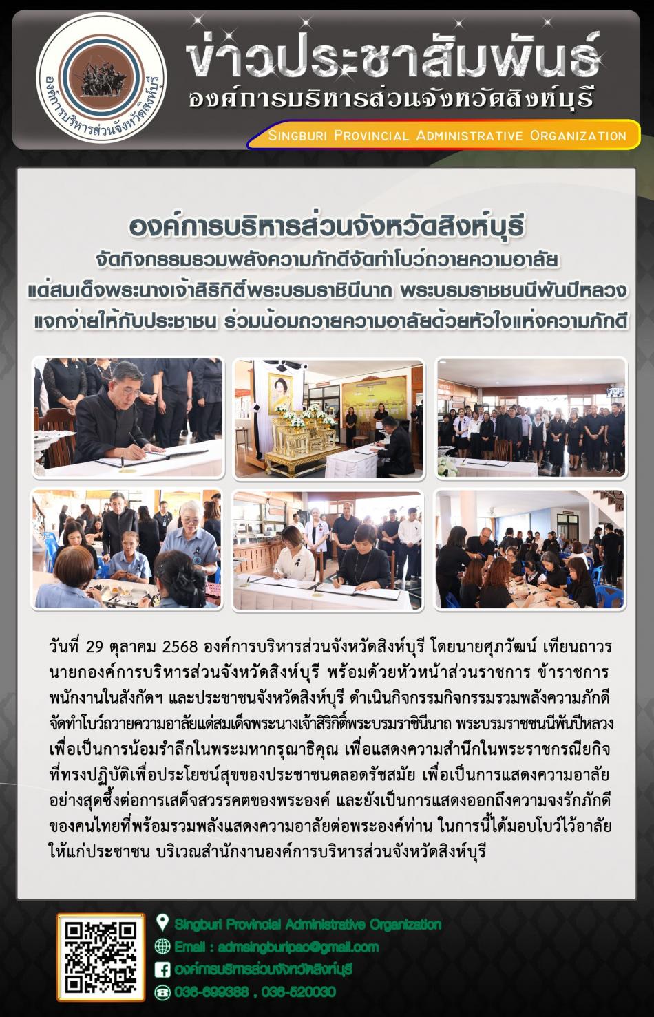 องค์การบริหารส่วนจังหวัดสิงห์บุรี จัดกิจกรรมรวมพลังความภักดีจัดทำโบว์ถวายความอาลัยแด่สมเด็จพระนางเจ้าสิริกิติ์พระบรมราชินีนาถ พระบรมราชชนนีพันปีหลวง แจกจ่ายให้กับประชาชน... [29 ตุลาคม 2568]