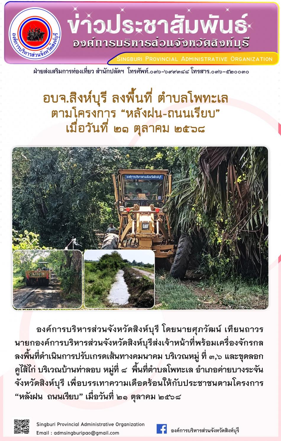 อบจ.สิงห์บุรี ลงพื้นที่ ตำบลโพทะเล ตามโครงการ “ หลัง ฝน- ถนนเรียบ” [21 ตุลาคม 2568]