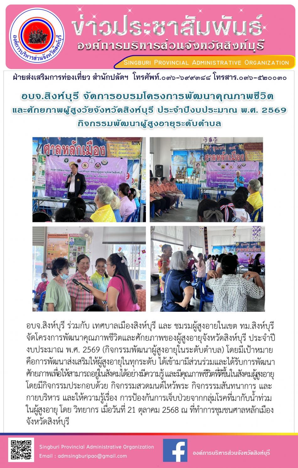 อบจ.สิงห์บุรี จัดโครงการพัฒนาคุณภาพชีวิตและศักยภาพของผู้สูงอายุ จังหวัดสิงห์บุรี ประจำปีงบประมาณ พ.ศ. 2569 กิจกรรมพัฒนาผู้สูงอายุระดับตำบล [21 ตุลาคม 2568]