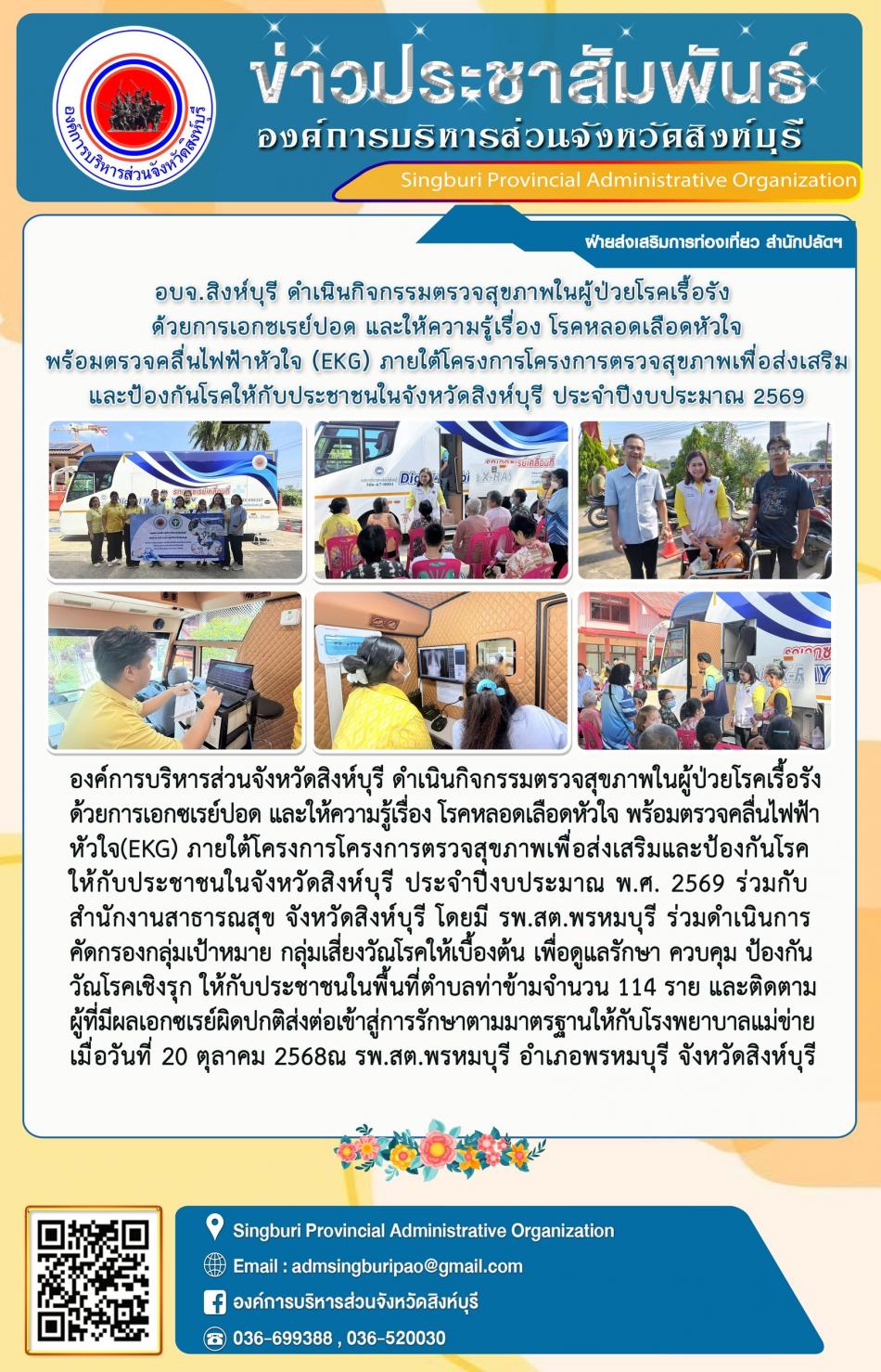 อบจ.สิงห์บุรี ดำเนินกิอกรรมให้ความรู้โรคหลอดเลือดหัวใจและให้บริการตรวจคลื่นไฟฟ้าหัวใจพร้อมตรวจคัดกรองวัณโรคเชิงรุกด้วยรถเอกชเรย์เคลื่อนที่ของอบจ. สิงห์บุรี [20 ตุลาคม 2568]