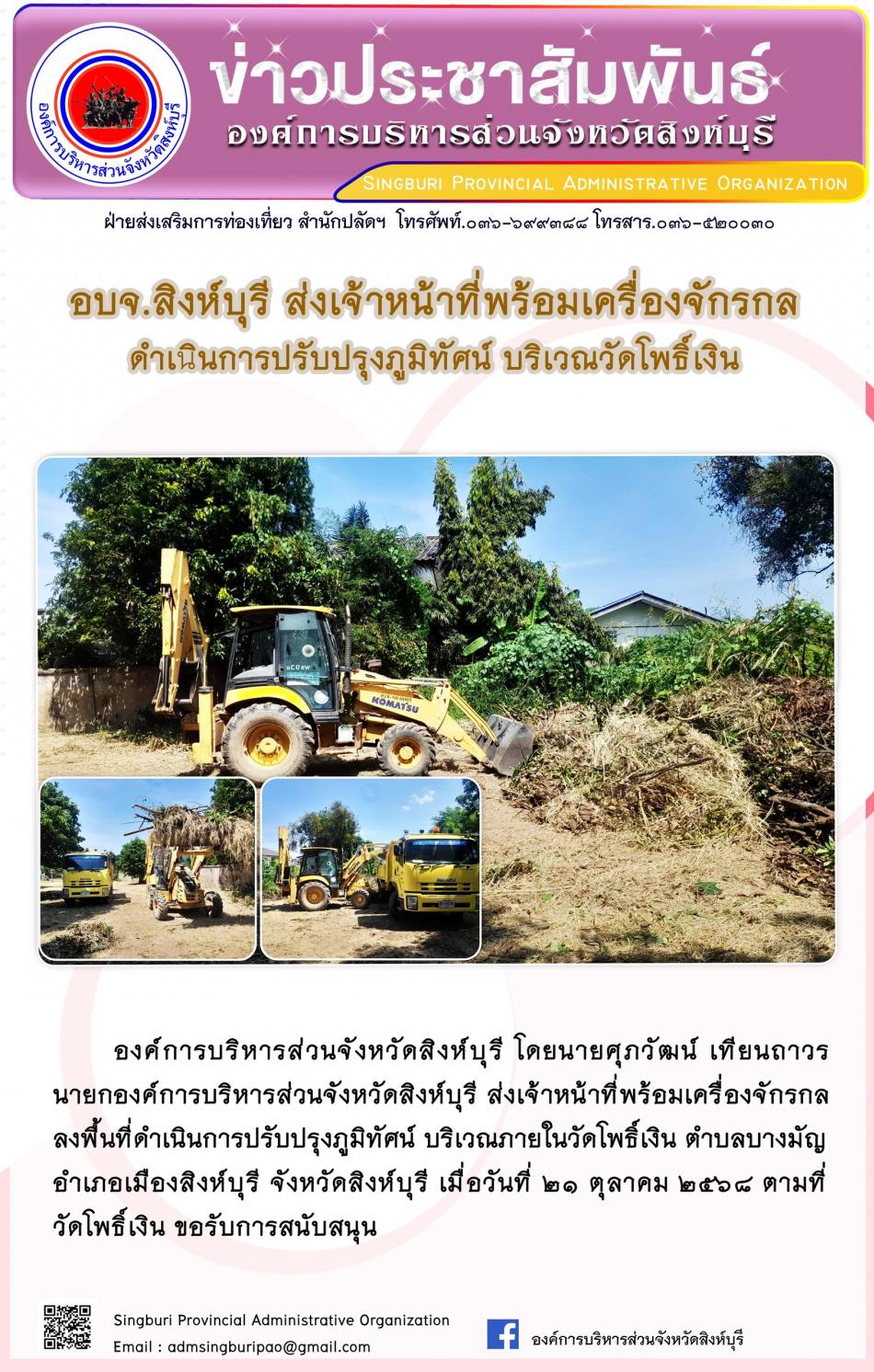 อบจ.สิงห์บุรี ส่งเจ้าหน้าที่พร้อมเครื่องจักรกล ดำเนินการปรับปรุงภูมิทัศน์ บริเวณวัดโพธิ์เงิน [21 ตุลาคม 2568]