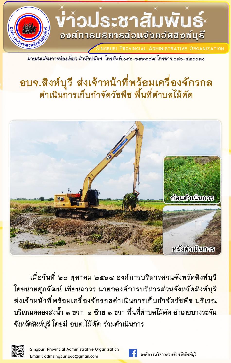 อบจ.สิงห์บุรี ส่งเจ้าหน้าที่พร้อมเครื่องจักรกล ดำเนินการเก็บกำจัดวัชพืช พื้นที่ตำบลไม้ดัด [20 ตุลาคม 2568]