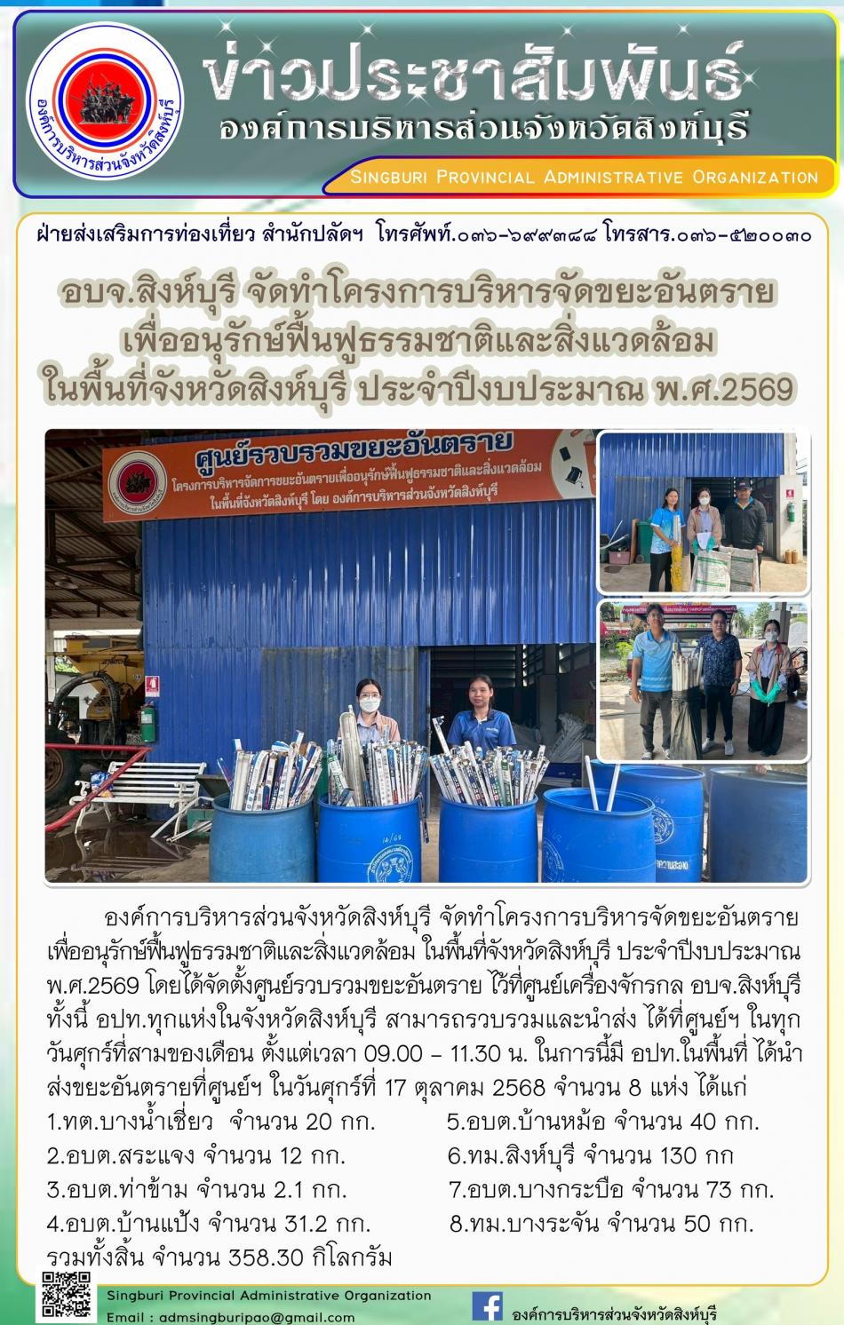 อบจ.สิงห์บุรี จัดทำโครงการ บริหารจัดการขยะอันตรายเพื่ออนุรักษ์ฟื้นฟูธรรมชาติและสิ่งแวดล้อมในพื้นที่จังหวัดสิงห์บุรี ประจำปีงบประมาณ พ.ศ. 2569 [17 ตุลาคม 2568]