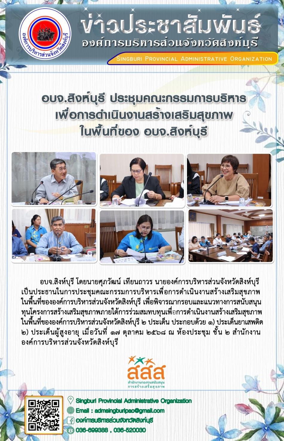 อบจ.สิงห์บุรี ประชุมคณะกรรมการบริหารเพื่อการดำเนินงานสร้างเสริมสุขภาพในพื้นที่ของอบจ. สิงห์บุรี [17 ตุลาคม 2568]