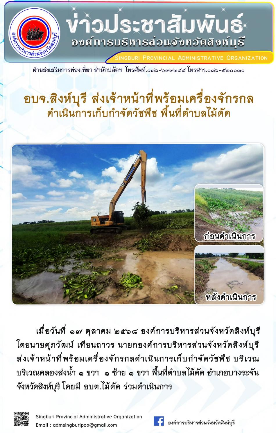 อบจ.สิงห์บุรี ส่งเจ้าหน้าที่พร้อมเครื่องจักรกล ดำเนินการเก็บกำจัดวัชพืช พื้นที่ตำบลไม้ดัด [17 ตุลาคม 2568]