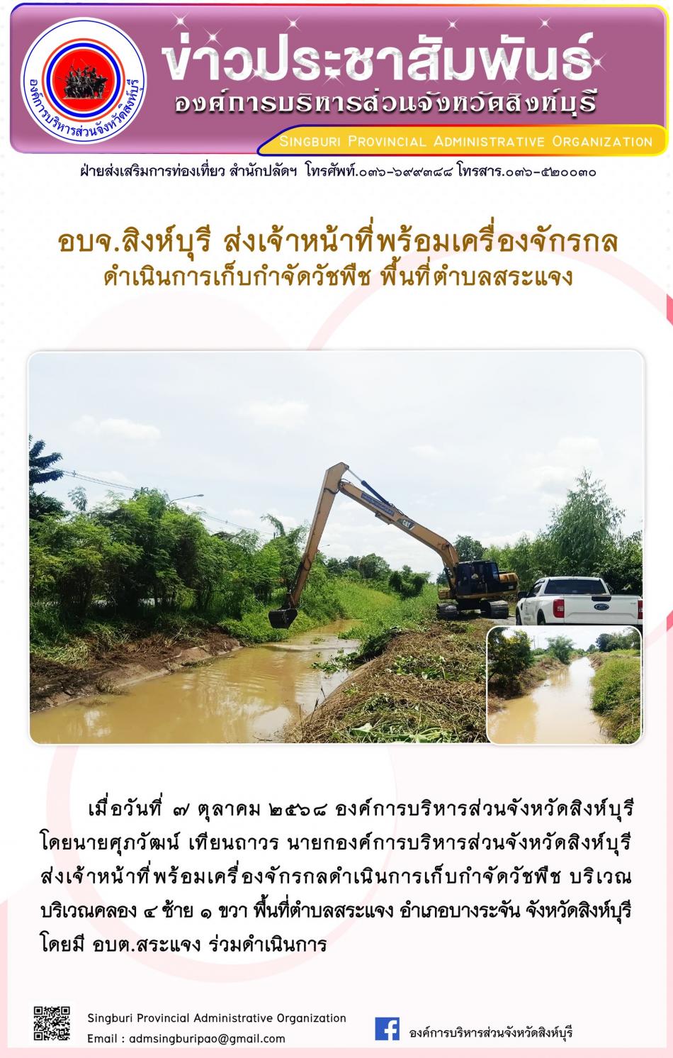 อบจ.สิงห์บุรี ส่งเจ้าหน้าที่พร้อมเครื่องจักรกล ดำเนินการเก็บกำจัดวัชพืช พื้นที่ตำบลสระแจง [7 ตุลาคม 2568]