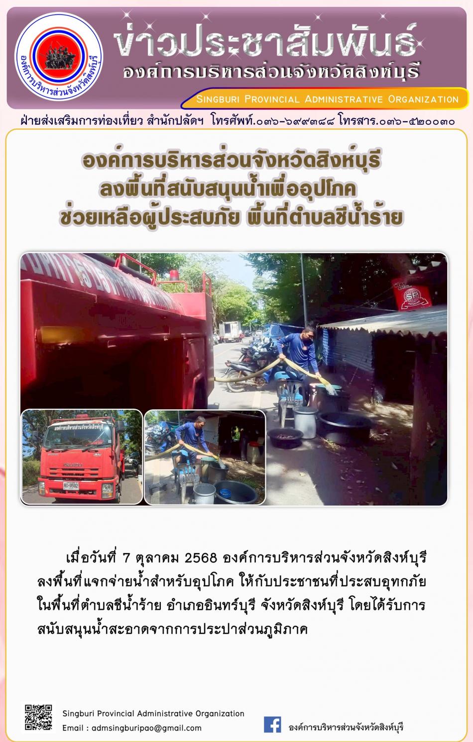 องค์การบริหารส่วนจังหวัดสิงห์บุรี ลงพื้นที่สนับสนุนน้ำเพื่ออุปโภคช่วยเหลือผู้ประสบภัย พื้นที่ตำบลชีน้ำร้าย [7 ตุลาคม 2568]