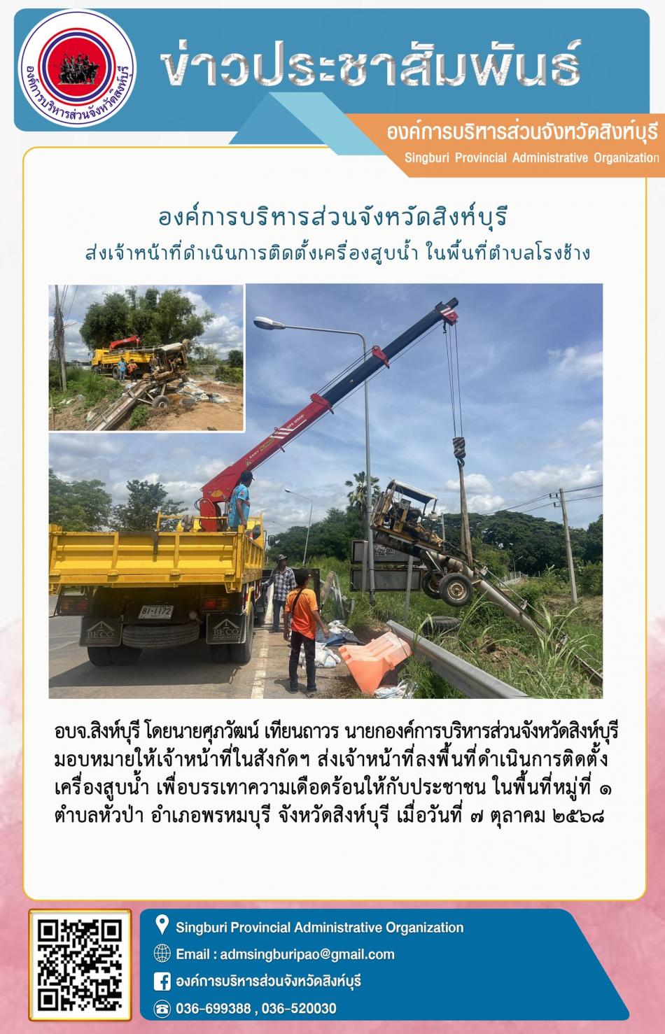 องค์การบริหารส่วนจังหวัดสิงห์บุรี ส่งเจ้าหน้าที่ดำเนินการติดตั้งเครื่องสูบน้ำ ในพื้นที่ตำบลโรงช้าง [7 ตุลาคม 2568]
