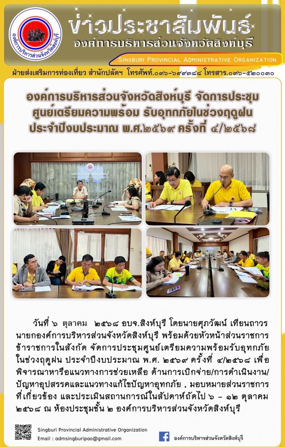 องค์การบริหารส่วนจังหวัดสิงห์บุรี จัดการประชุมศูนย์เตรียมความพร้อม รับอุทกภัยในช่วงฤดูฝน ประจำปีงบประมาณ พ.ศ. 2569 ครั้งที่ 4/2568 [6 ตุลาคม 2568]