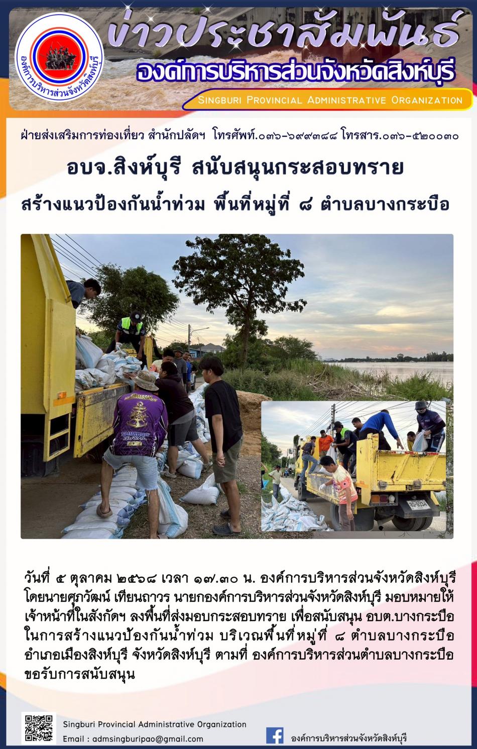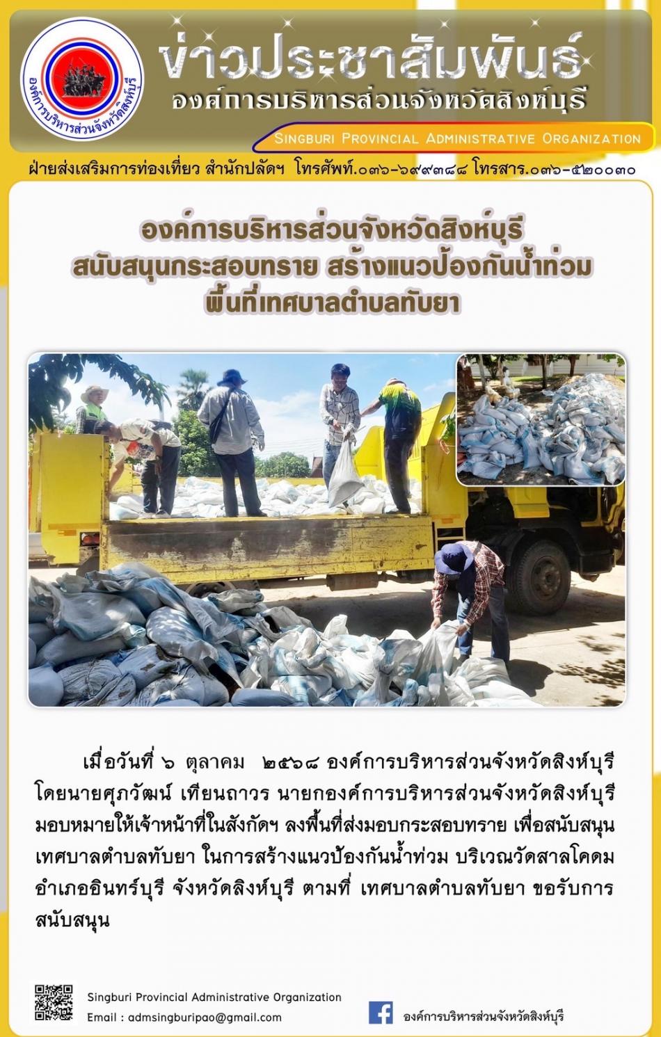 องค์การบริหารส่วนจังหวัดสิงห์บุรี สนับสนุนกระสอบทราย สร้างแนวป้องกันน้ำท่วม พื้นที่เทศบาลตำบลทับยา [6 ตุลาคม 2568]