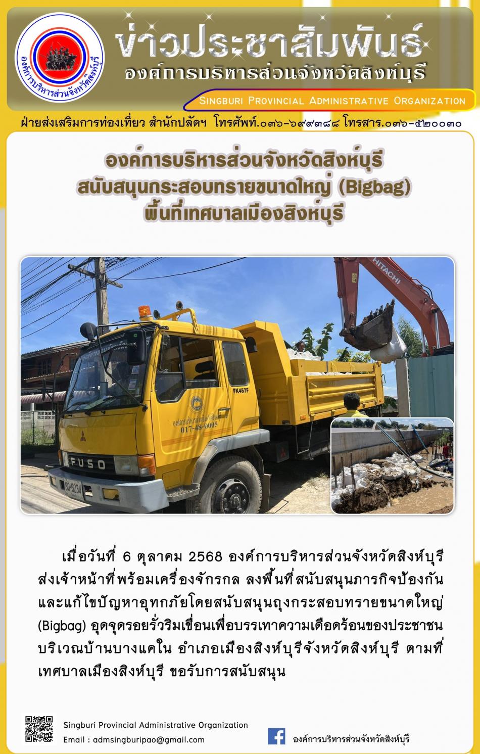 องค์การบริหารส่วนจังหวัดสิงห์บุรี สนับสนุนกระสอบทรายขนาดใหญ่ ( big bag ) พื้นทีเทศบาลเมืองสิงห์บุรี [6 ตุลาคม 2568]