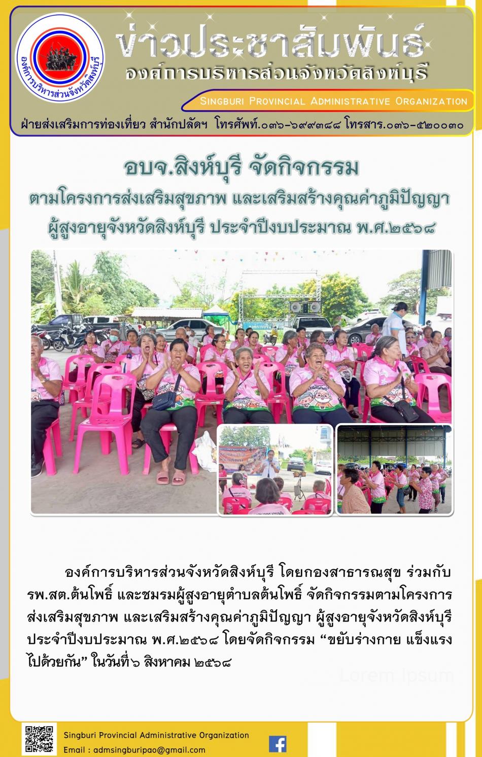 อบจ.สิงห์บุรี จัดกิจกรรม ตามโครงการส่งเสริมสุขภาพ และเสริมสร้างคุณค่าภูมิปัญญาผู้สูงอายุจังหวัดสิงห์บุรี ประจำปีงบประมาณพ.ศ. 2500 [6 ตุลาคม 2568]